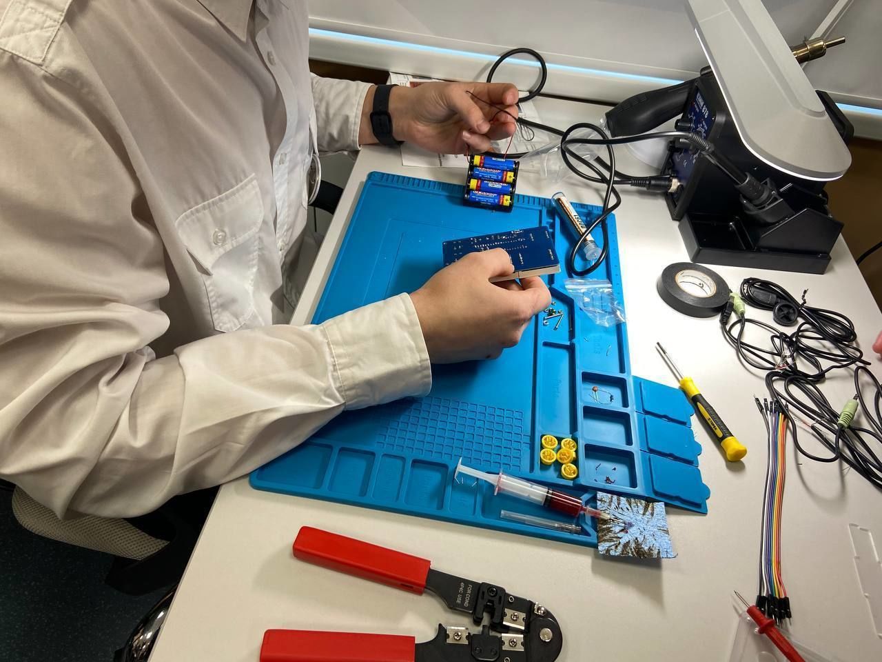 Конструкторское бюро разместилось в специально оборудованном учебном кабинете, оснащенном 3D-принтерами, сканерами, графическими планшетами, лазерным станком и паяльными станциями. Здесь планируется проводить внеурочные занятия и мастер-классы с участием партнеров образовательного учреждения, среди которых СПбГАСУ, ПАО «Россети.Ленэнерго», Горный институт и БГТУ «Военмех».