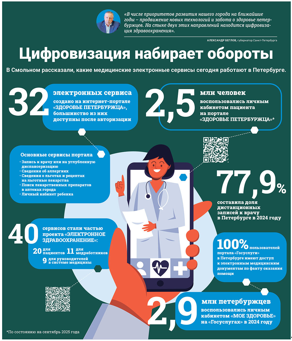 «В числе приоритетов развития нашего города на ближайшие годы – продвижение новых технологий и забота о здоровье петербуржцев. На стыке двух этих направлений находится цифровизация здравоохранения», – отметил губернатор Александр Беглов.