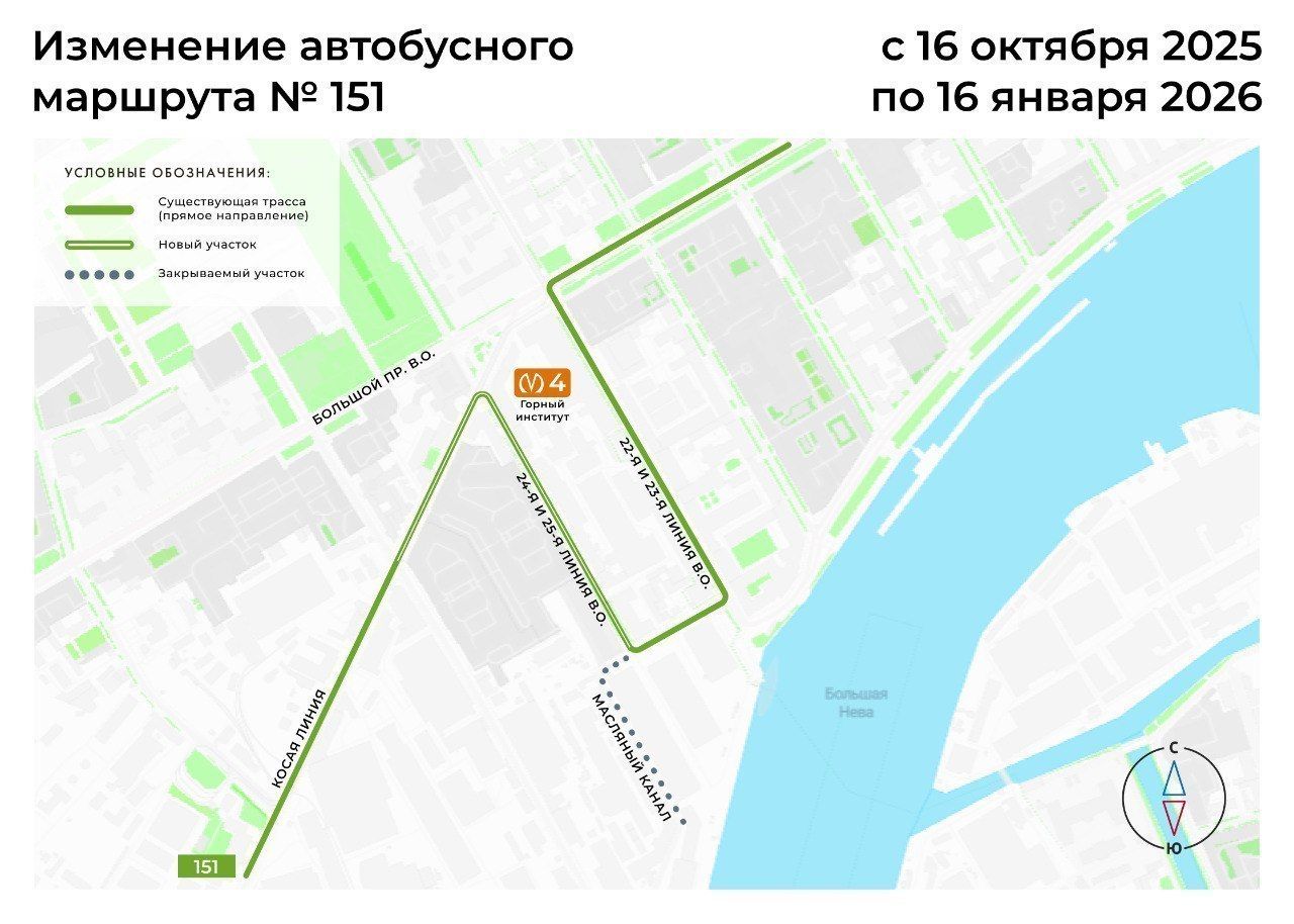 В Петербурге в связи с работами на Масляном канале с 16 октября по 16 января 2026 года вносятся изменения в маршрут автобуса №151 «АС «Наличная ул.» – АС «Наличная ул.», сообщает ГКУ «Организатор перевозок».