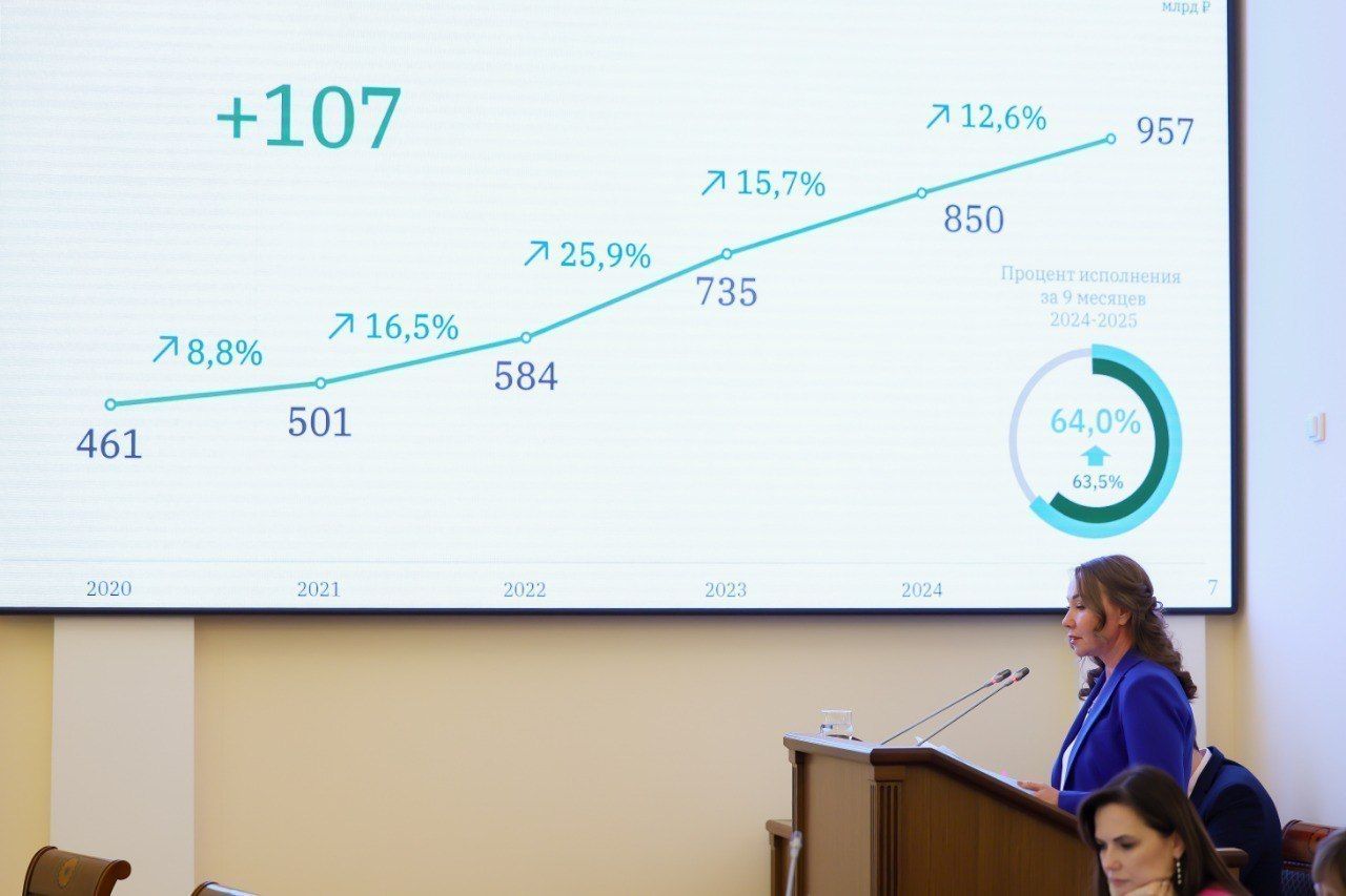 За первые девять месяцев 2025 года доходы бюджета Петербурга составили 1 триллион 5,3 миллиарда рублей, увеличившись на 74,4 миллиарда рублей (8%) по сравнению с аналогичным периодом прошлого года. Исполнение уточненного годового плана достигло 75,4%. Собственные налоговые и неналоговые поступления города за этот период составили 975,6 миллиарда рублей, что составляет 97,0% от общего объема доходов.