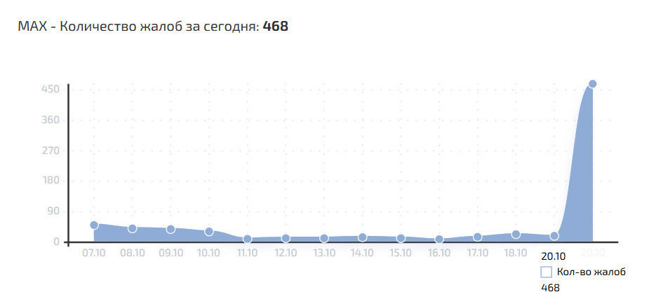 «Сбой.РФ» вечером, 20 октября, сообщил о проблемах в работе мессенджера Max. За последние 15 минут поступило 67 жалоб, передаёт телеграм-канал сервиса.