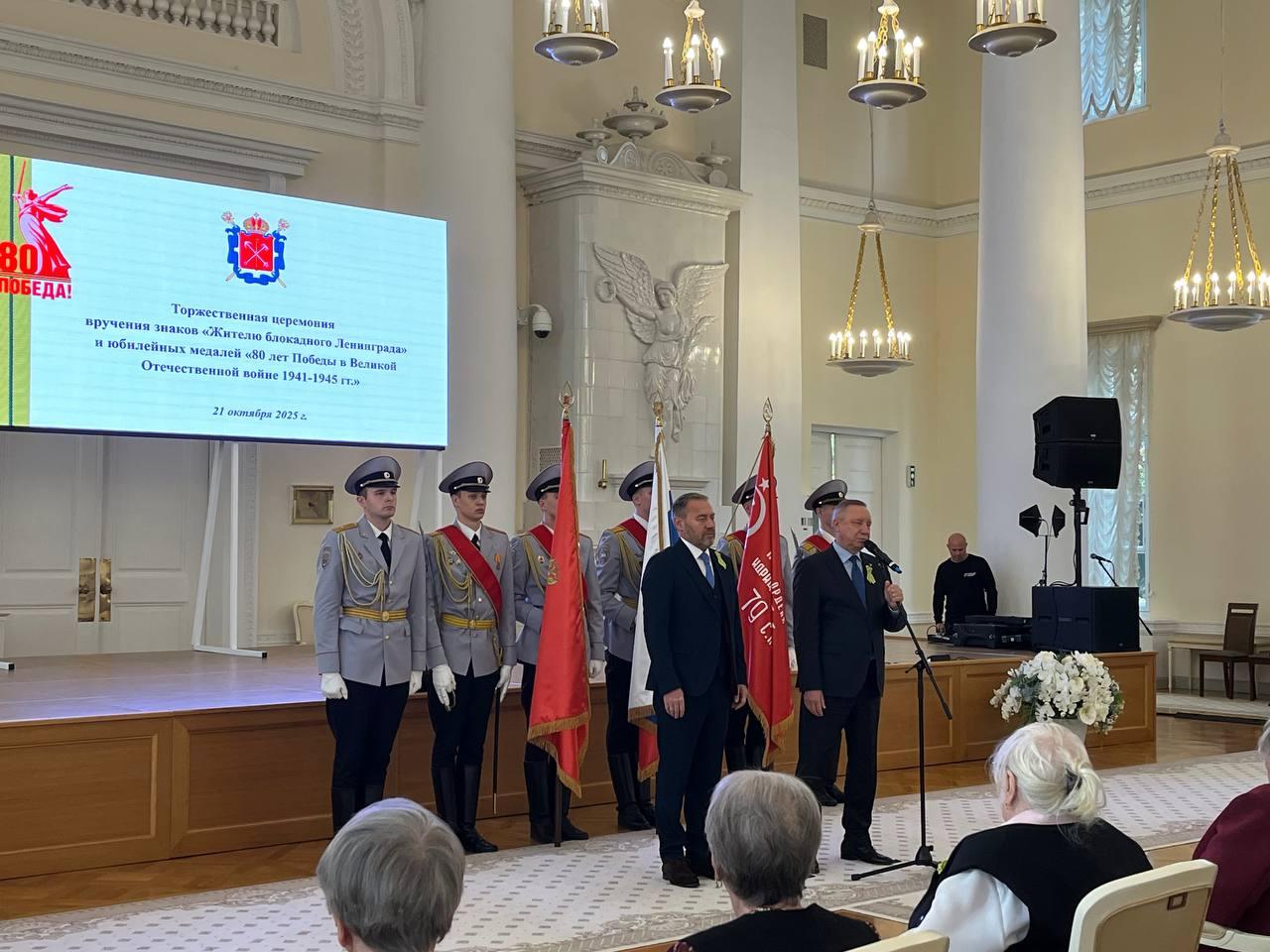 Губернатор Санкт-Петербурга Александр Беглов и председатель Законодательного Собрания Александр Бельский вручили 35-ти ленинградцам, которые прожили в блокадном городе менее четырех месяцев, знаки «Жителю блокадного Ленинграда» и юбилейные медали «80 лет Победы в Великой Отечественной войне 1941-1945 гг.»