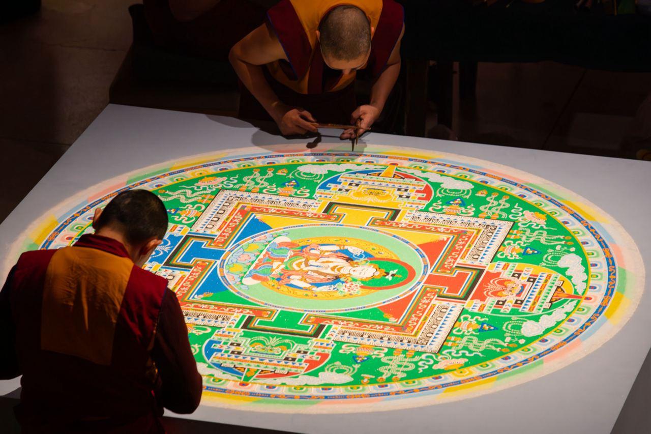 На снимке запечатлен процесс создания мандалы – сакральной диаграммы, занимающей центральное место в буддийской духовной практике. Композиция состоит из нескольких уровней: в центре размещен образ бодхисаттва Авалокитешвара, тогда как внешние контуры символизируют фундаментальные элементы мироздания – пространство, воздух, воду, землю и огонь. Особое значение имеет расположенный между ними квадрат, строго ориентированный по сторонам света.