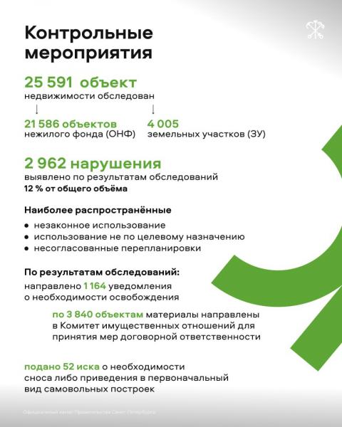 Почти 25 600 объектов недвижимости обследовали и 1559 незаконно занятых зданий освободили специалисты Комитета по контролю за имуществом за девять месяцев этого года, сообщили сегодня в пресс-службе правительства Петербурга.