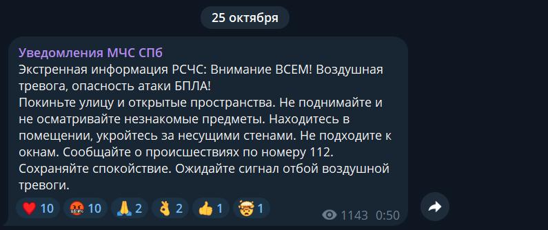 В Петербурге среди ночи объявили воздушную тревогу. Горожанам рекомендуется покинуть улицы и сохранять спокойствие, следует из экстренного предупреждения РСЧС.