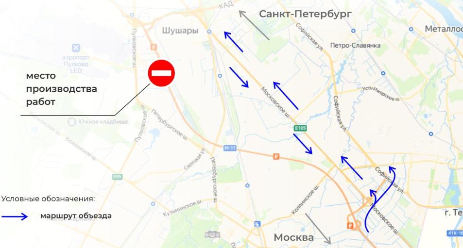 Кратковременные остановки требуются для безопасного монтажа конструкций новой транспортной развязки. Она соединит магистраль с дорогой, ведущей напрямую к аэропорту Пулково.