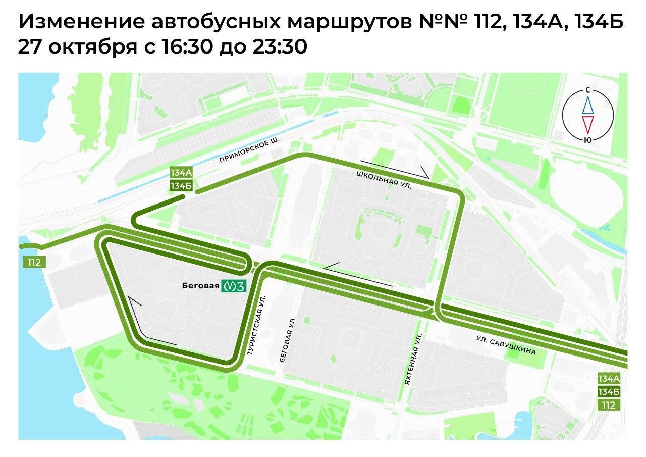 – в обоих направлениях: по действующей трассе по ул. Савушкина без заезда на Беговую ул., Приморский пр., Яхтенную ул.