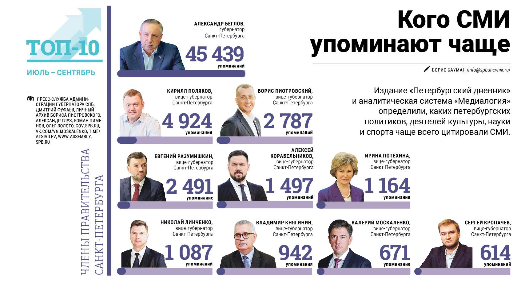 Издание «Петербургский дневник» и аналитическая система «Медиалогия» определили, каких петербургских политиков чаще всего цитировали СМИ с июля по сентябрь. Так, на первом месте оказался губернатор Петербурга Александр Беглов – 45 439 упоминаний.