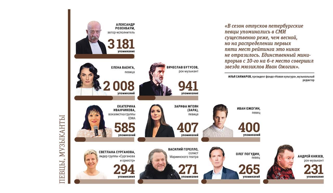 «В сезон отпусков петербургские певцы упоминались в СМИ существенно реже, чем весной, но на распределении первых пяти мест рейтинга это никак не отразилось. Единственный мини-прорыв с 10-го на 6-е место совершил звезда мюзиклов Иван Ожогин», – поделился Илья Сакмаров, президент фонда «Новая культура» и музыкальный редактор.