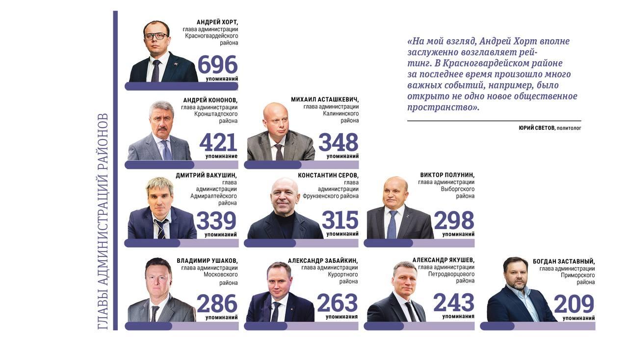 На втором месте – глава администрации Кронштадтского района Андрей Кононов с 421 упоминанием, на третьем – глава администрации Калининского района Михаил Асташкевич, у него 348 упоминаний. Также в десятку лидеров вошли Дмитрий Вакушин, Константин Серов, Виктор Полунин, Владимир Ушаков, Александр Забайкин, Александр Якушев, Богдан Заставный.