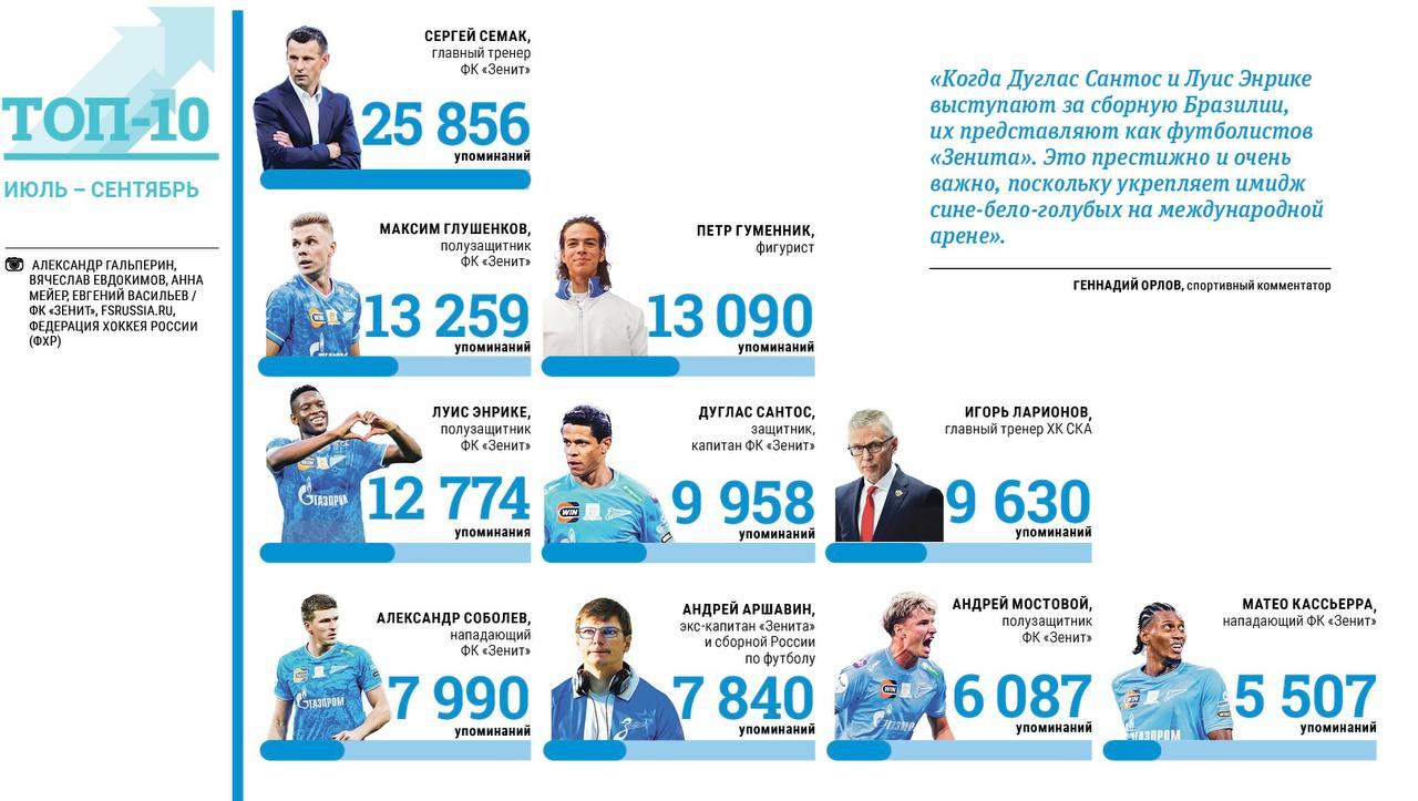 Высокие места среди футболистов «Зенита» заняли Луис Энрике и Дуглас Сантос, большому интересу к ним способствовали их матчи за национальную сборную Бразилии.