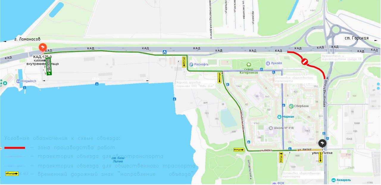 Движение транспорта в объезд участка проведения работ будет осуществляться в соответствии со схемой организации дорожного движения через съезд к портовому комплексу «Моби Дик» и далее по улице Гидростроителей, Цитадельскому шоссе и улице Литке.