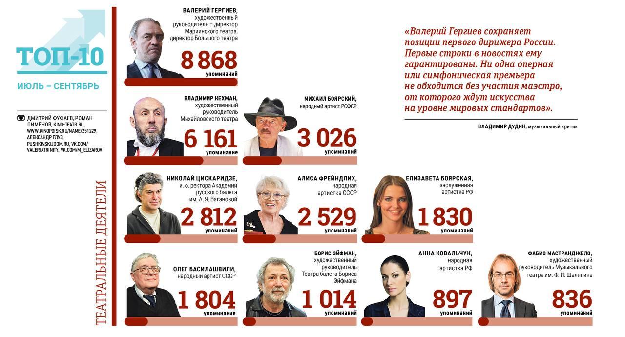 В рейтинге «Медиалогии» вновь лидирует Валерий Гергиев. Он сохраняет позиции первого дирижера России, являясь генеральным директором не только Мариинского, но и Большого театров, включающих также филиалы во Владивостоке и Владикавказе.
