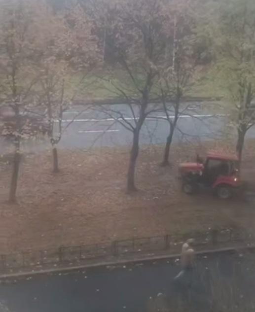 На кадрах видно, что тракторист убирает листву, описывая круги перед березами. После задним ходом он пытается выехать на проезжую часть. Но, видимо, вспомнив, что выполнил работу не полностью, он возвращается. И вновь продолжает кружить вокруг деревьев.