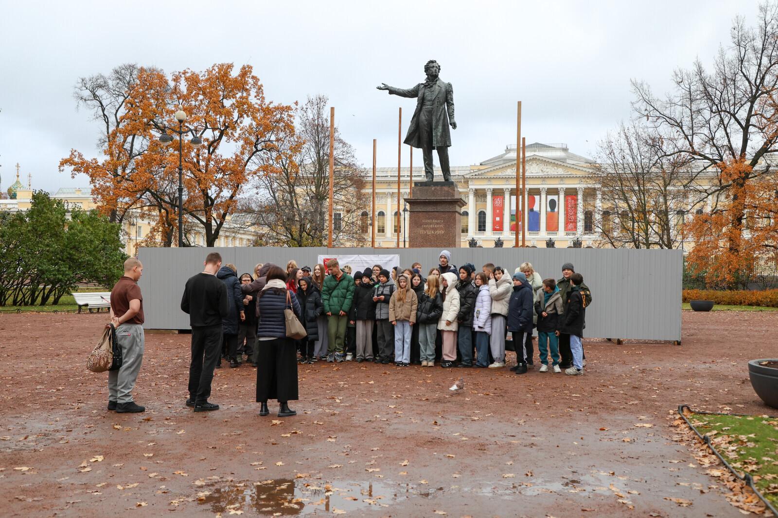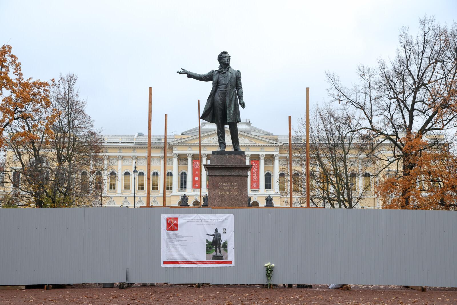 В Петербурге начались ремонтные работы на памятнике Александру Пушкину, который украшает площадь Искусств