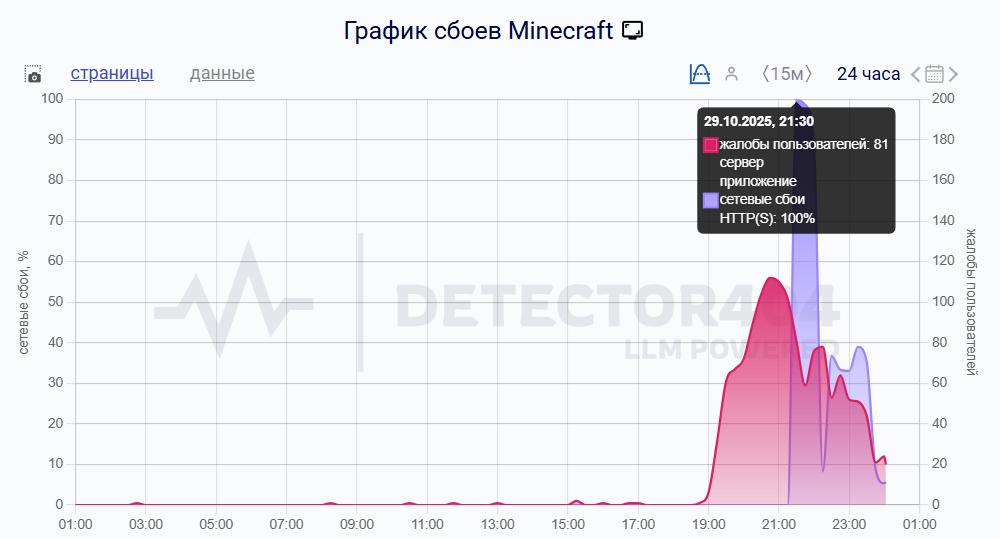 Вечером в среду россияне сообщили о сбое в работе компьютерной игры Minecraft. Пик жалоб зафиксирован в 21:30, следует из данных сервиса Downdetector.