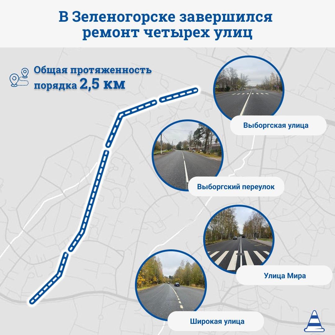 В городе Зеленогорске Курортного района Петербурга завершен  ремонт на четырех улицах: Широкой улице, улице Мира, Выборгской улице и в Выборгском переулке.
