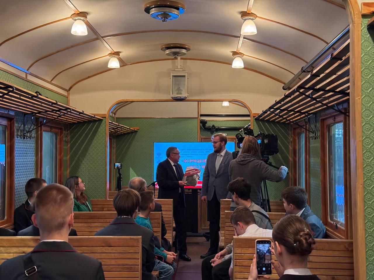 Внутри пригородного вагона Ок 3906, построенного на ленинградском заводе имени И. Е. Егорова, состоялась творческая встреча с писателем Дмитрием Каралисом, автором книги «Коридор бессмертия».