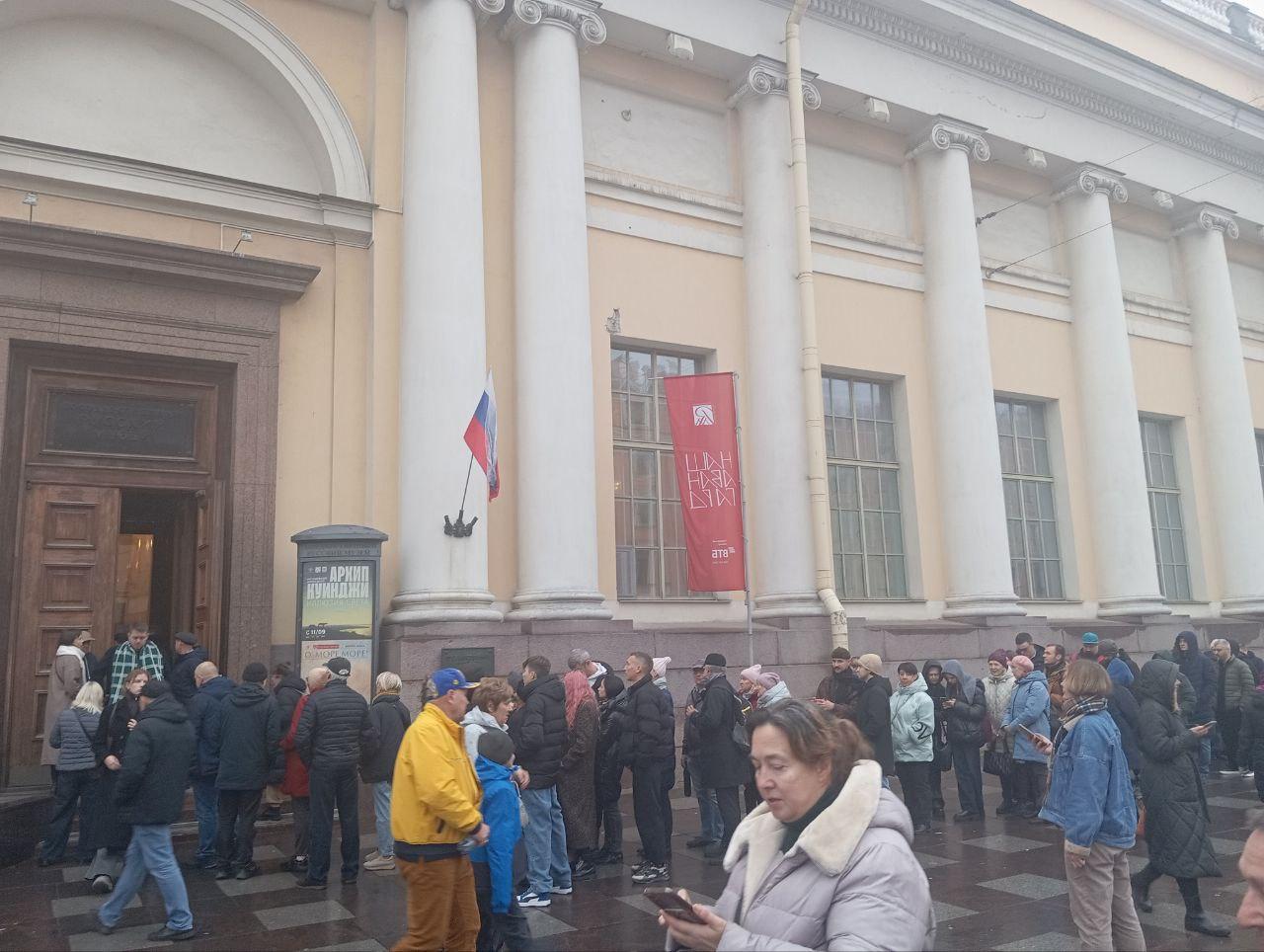 Кадры людей в ожидании посещения популярной экспозиции «Архип Куинджи. Иллюзия света» запечатлел корреспондент «Петербургского дневника». Около сотни горожан и гостей города стоят в очереди, несмотря на непогоду: в городе пасмурно и моросит.