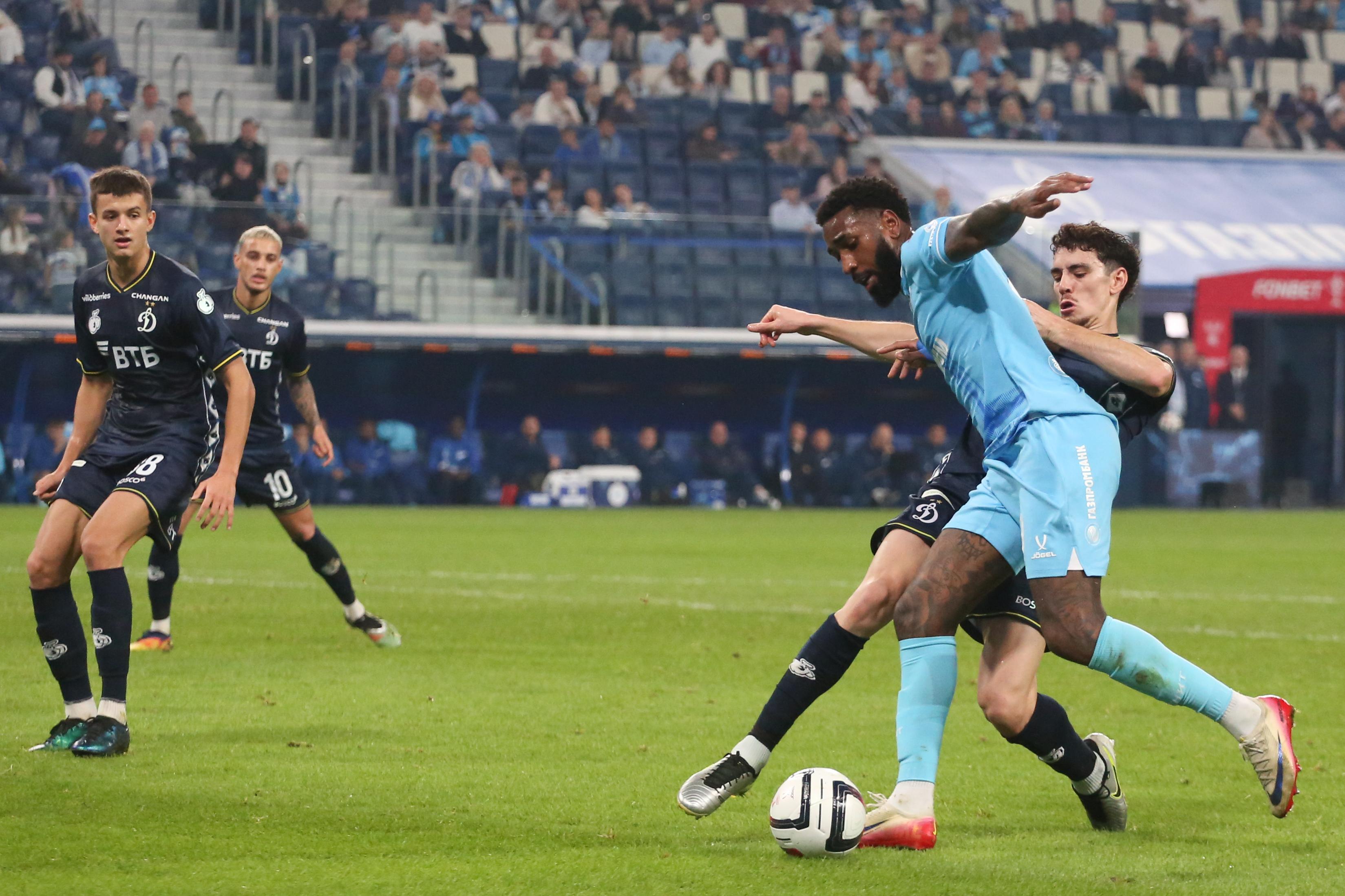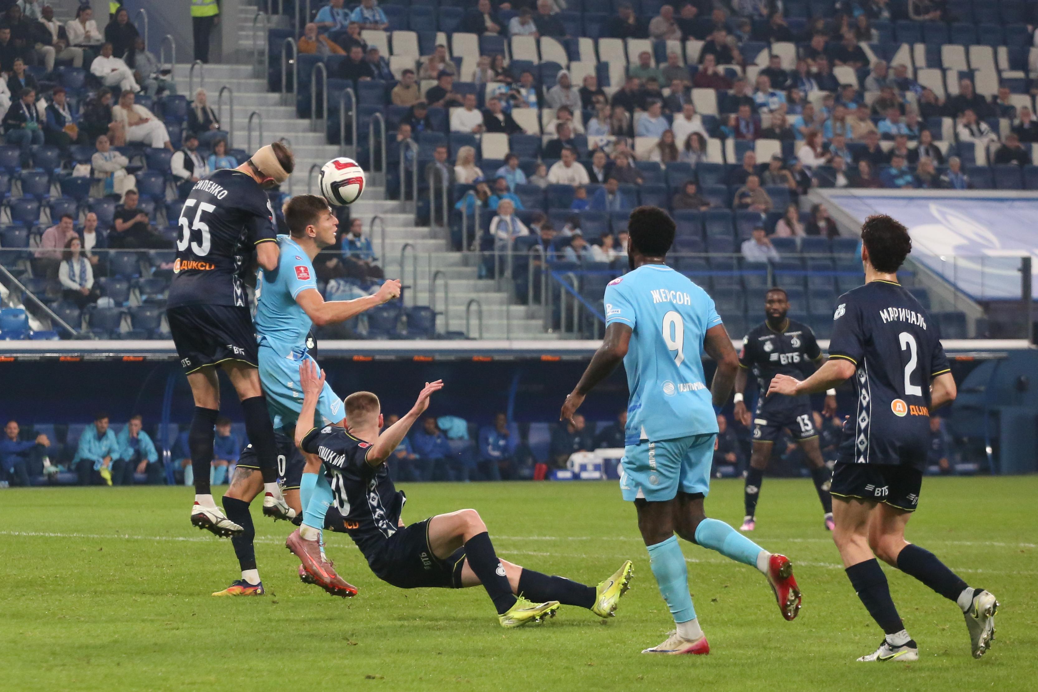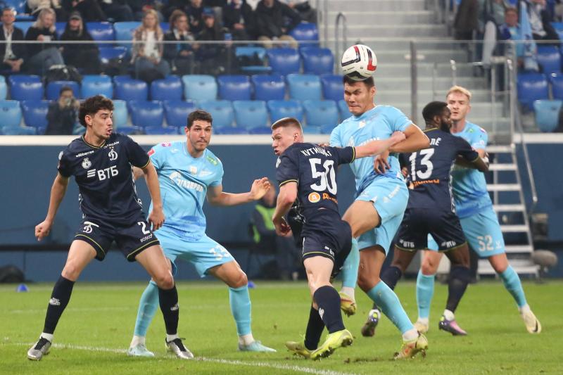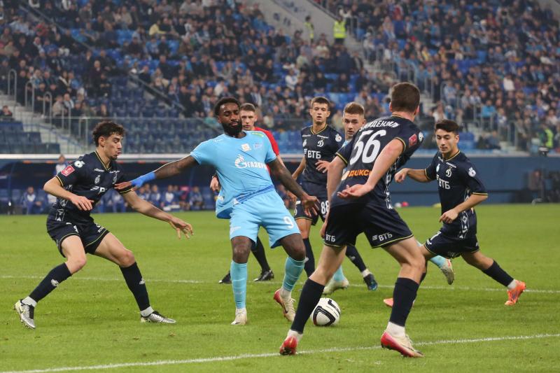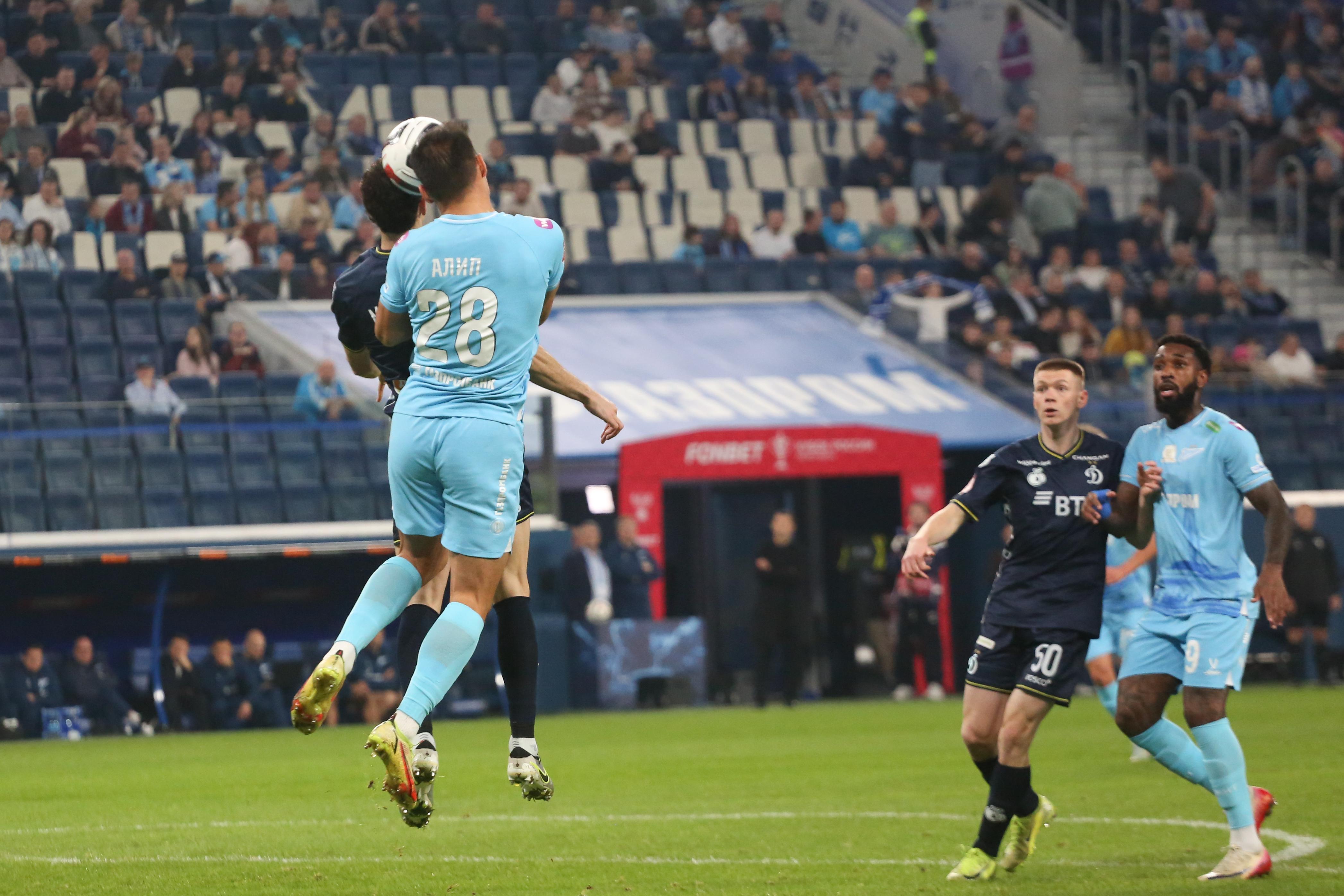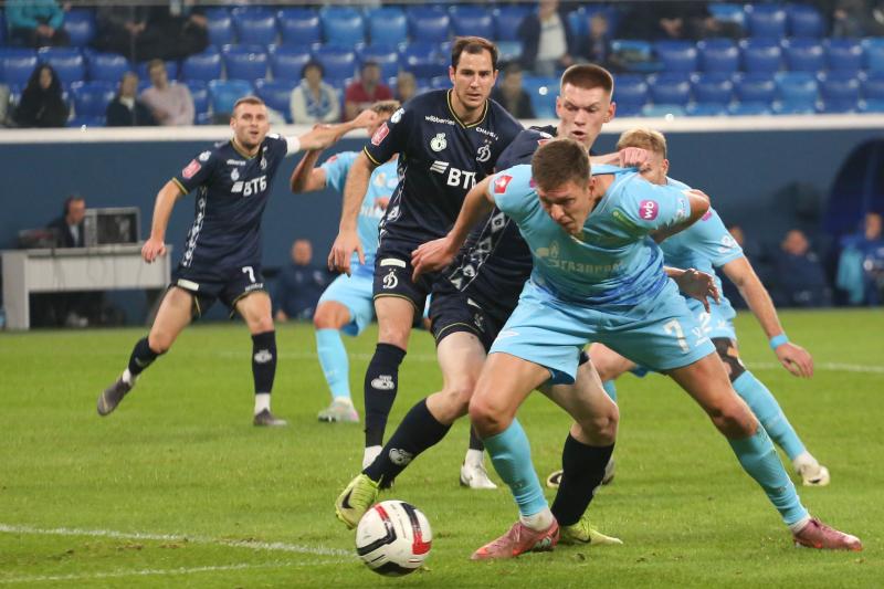 Первый тайм получился скупым на опасные моменты. Зенитовцы в таком варианте состава долго налаживали взаимодействие. Динамовцы, у которых ротация не была столь масштабной, смотрелись более сыгранной командой. На 30-й минуте гости получили право на штрафной удар с очень хорошей позиции, но Бителло пробил в «стенку». Последовали два угловых у ворот хозяев, но москвичи не создали угроз.