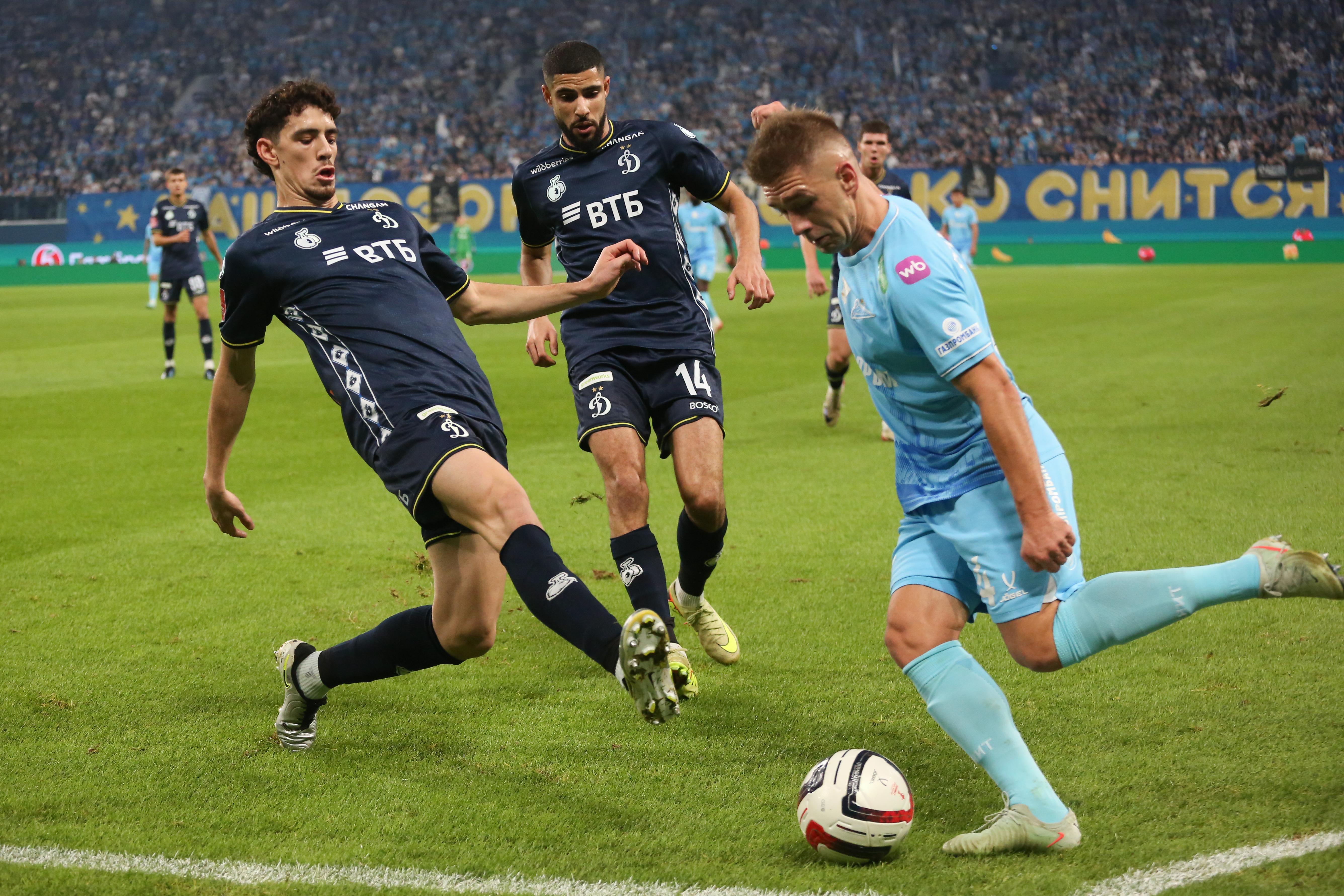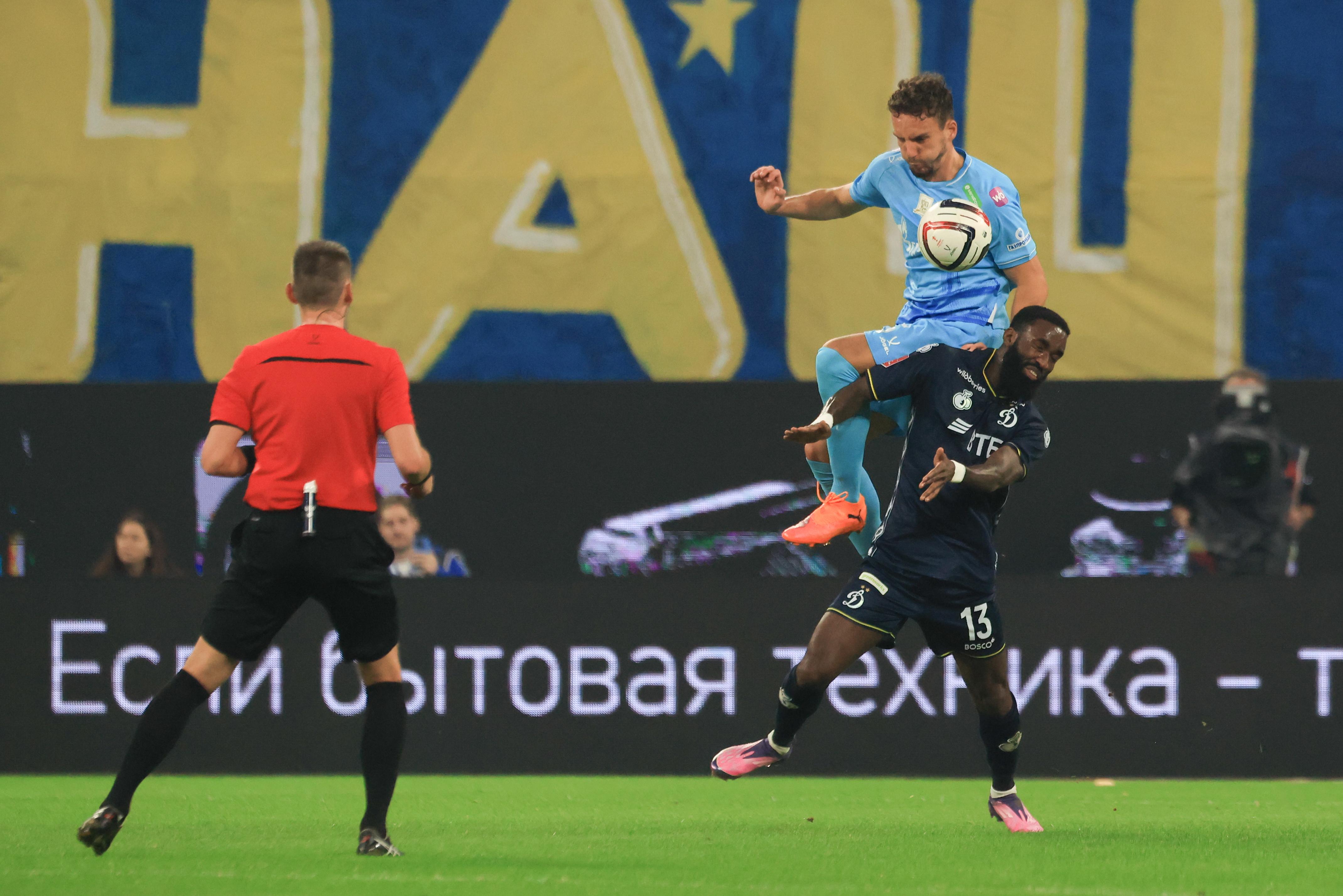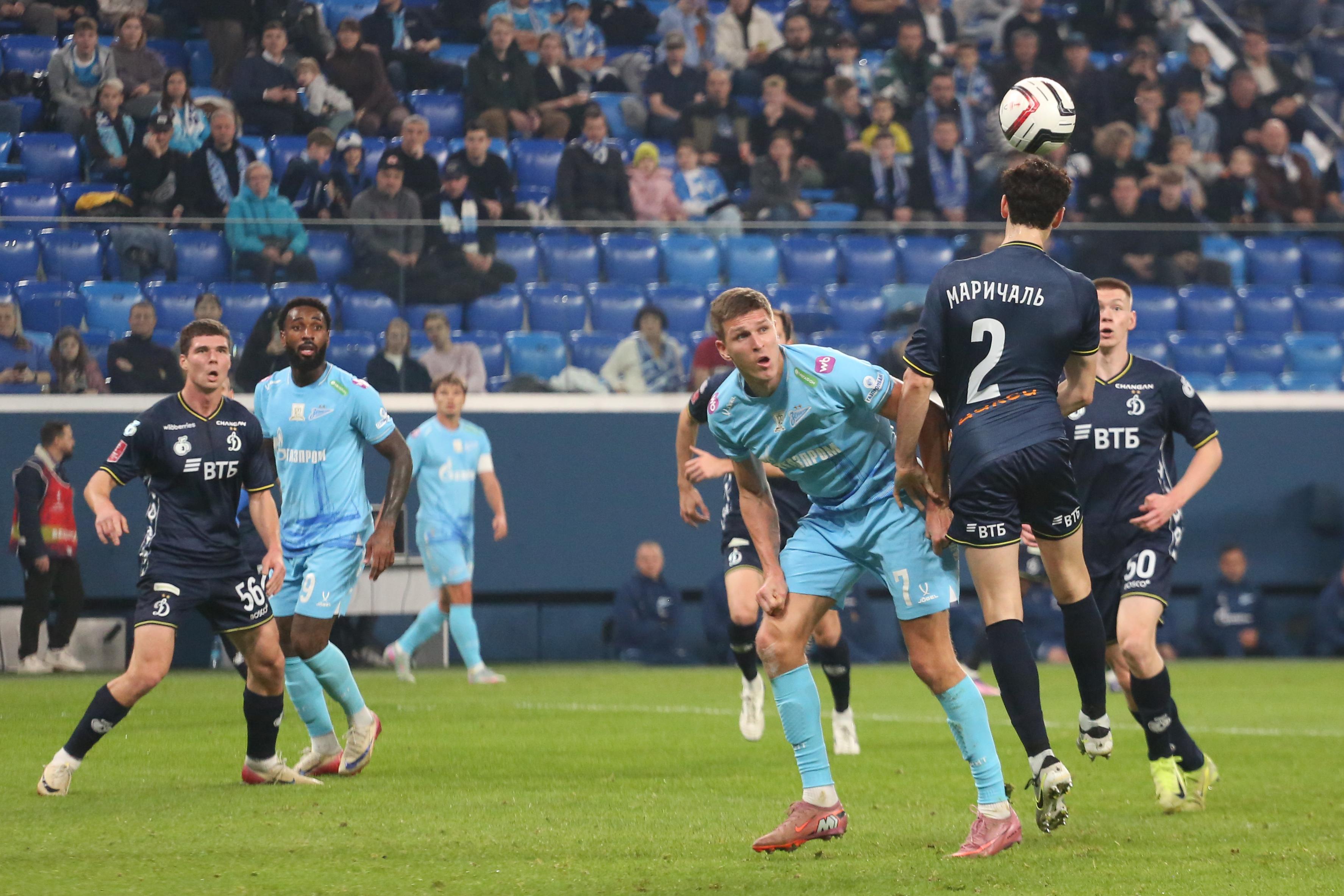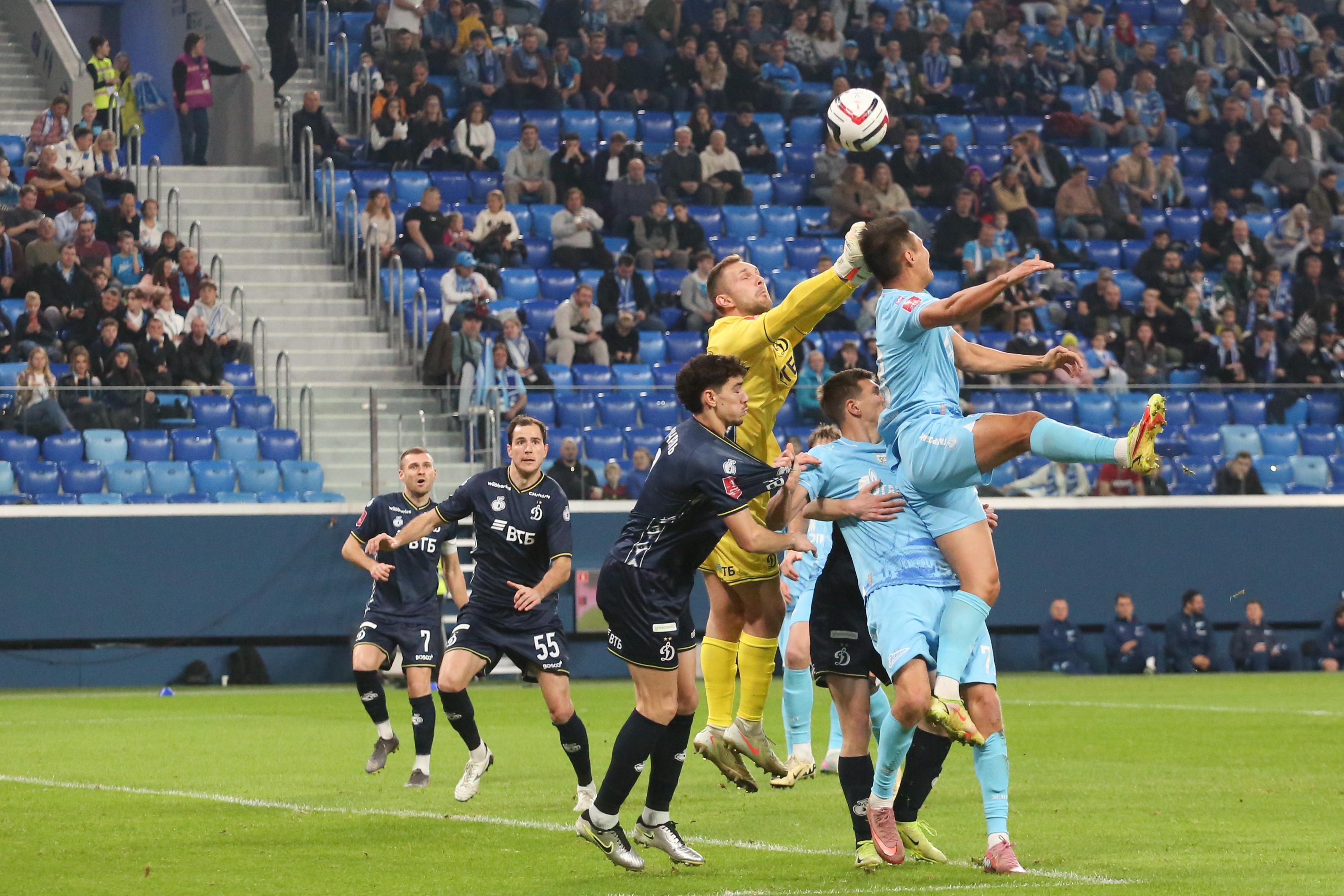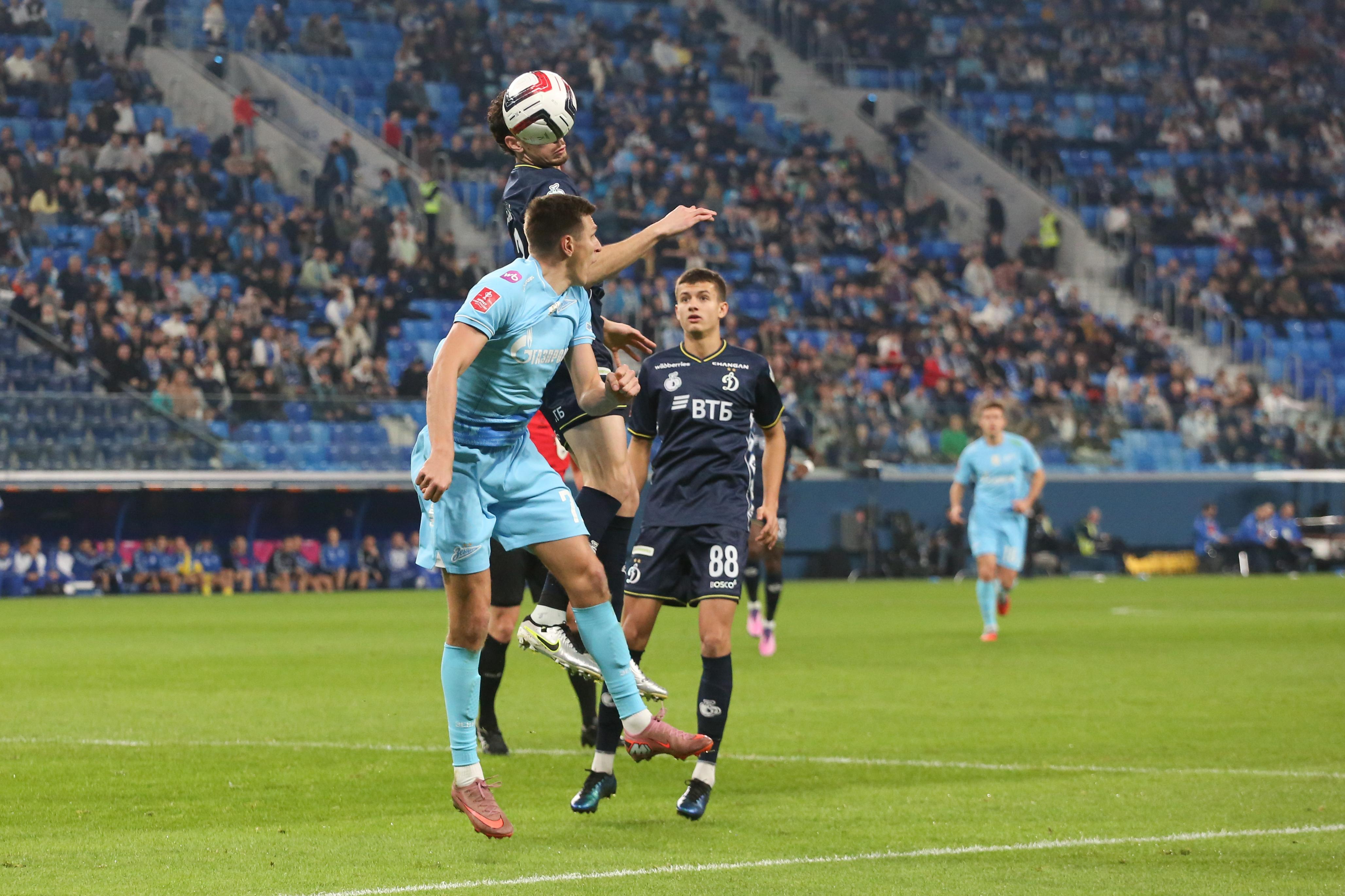 Первый тайм получился скупым на опасные моменты. Зенитовцы в таком варианте состава долго налаживали взаимодействие. Динамовцы, у которых ротация не была столь масштабной, смотрелись более сыгранной командой. На 30-й минуте гости получили право на штрафной удар с очень хорошей позиции, но Бителло пробил в «стенку». Последовали два угловых у ворот хозяев, но москвичи не создали угроз.