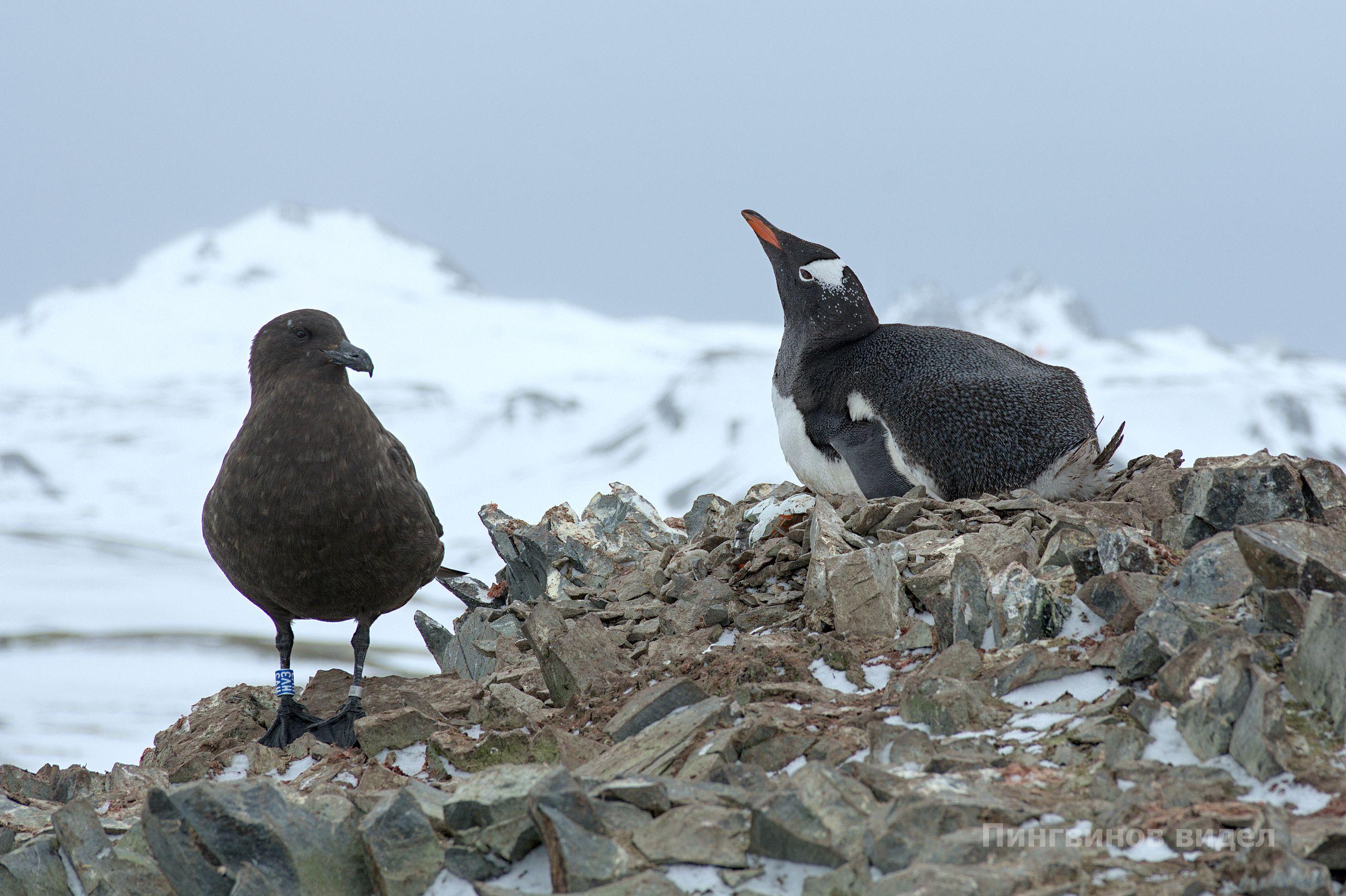 – С приходом весны прилетели и поморники – это главные враги пингвинов в период гнездования. Они воруют яйца и маленьких птенцов. Недавно я видел, как поморник пытался атаковать пингвина и вытащить яйцо из кладки, но не смог согнать его с гнезда.