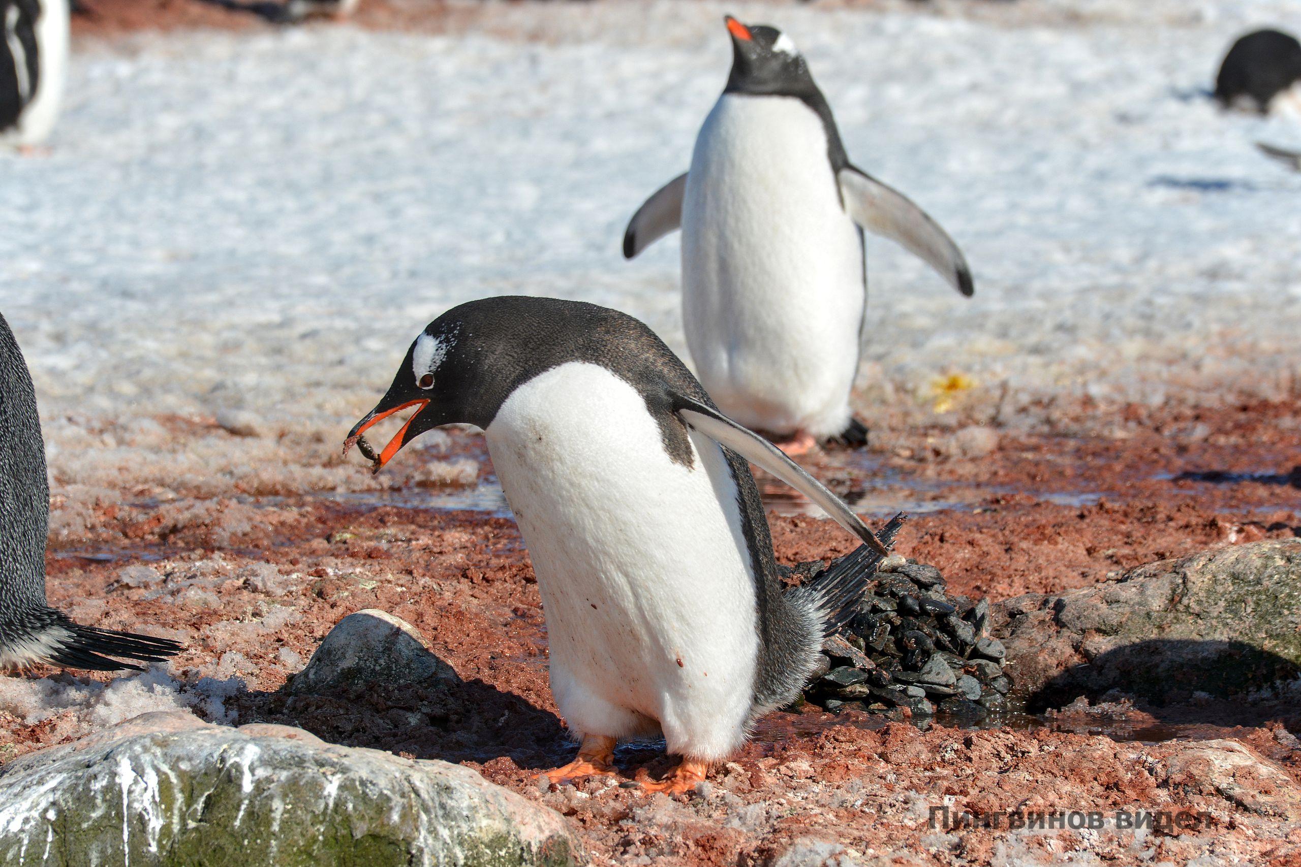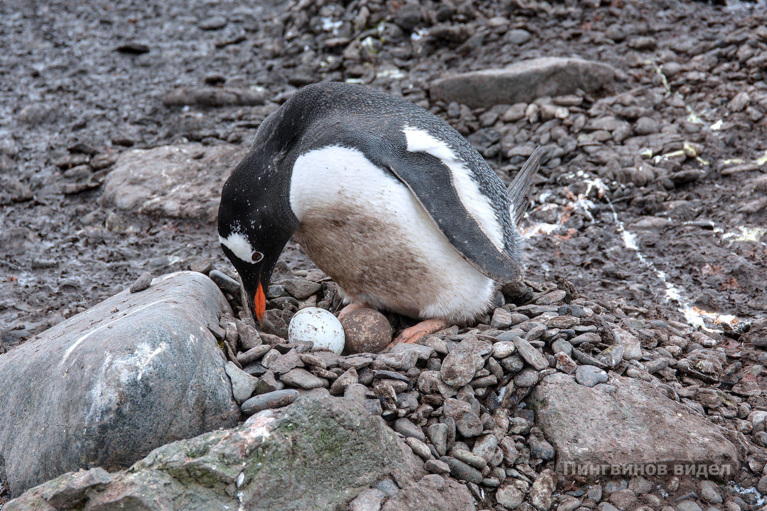 Пингвины занимают участки, свободные от снега, и строят гнезда из мелких камушков. Считается, что лучший подарок самца самке – самый красивый и гладкий камушек для гнезда. Пингвины ревностно охраняют свои постройки, вокруг постоянно слышен шум и гам. Порой случаются стычки из‑за украденных камушков. Сейчас у пингвинов началась кладка яиц. Примерно через пять недель появятся маленькие пингвинята.