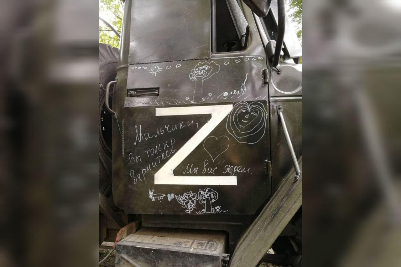 Увидев, что один из водителей отошёл от своей машины, дети подбегают к кабине и оставляют свои послания для военных на её двери. Буква Z теперь окружена зайчиками, цветочками и солнышками. Подходит мама Маши, детей за баловство она не ругает, напротив, берёт маркер и красивым ровным почерком выводит: «Мальчики, вы только вернитесь. Мы вас ждём…»