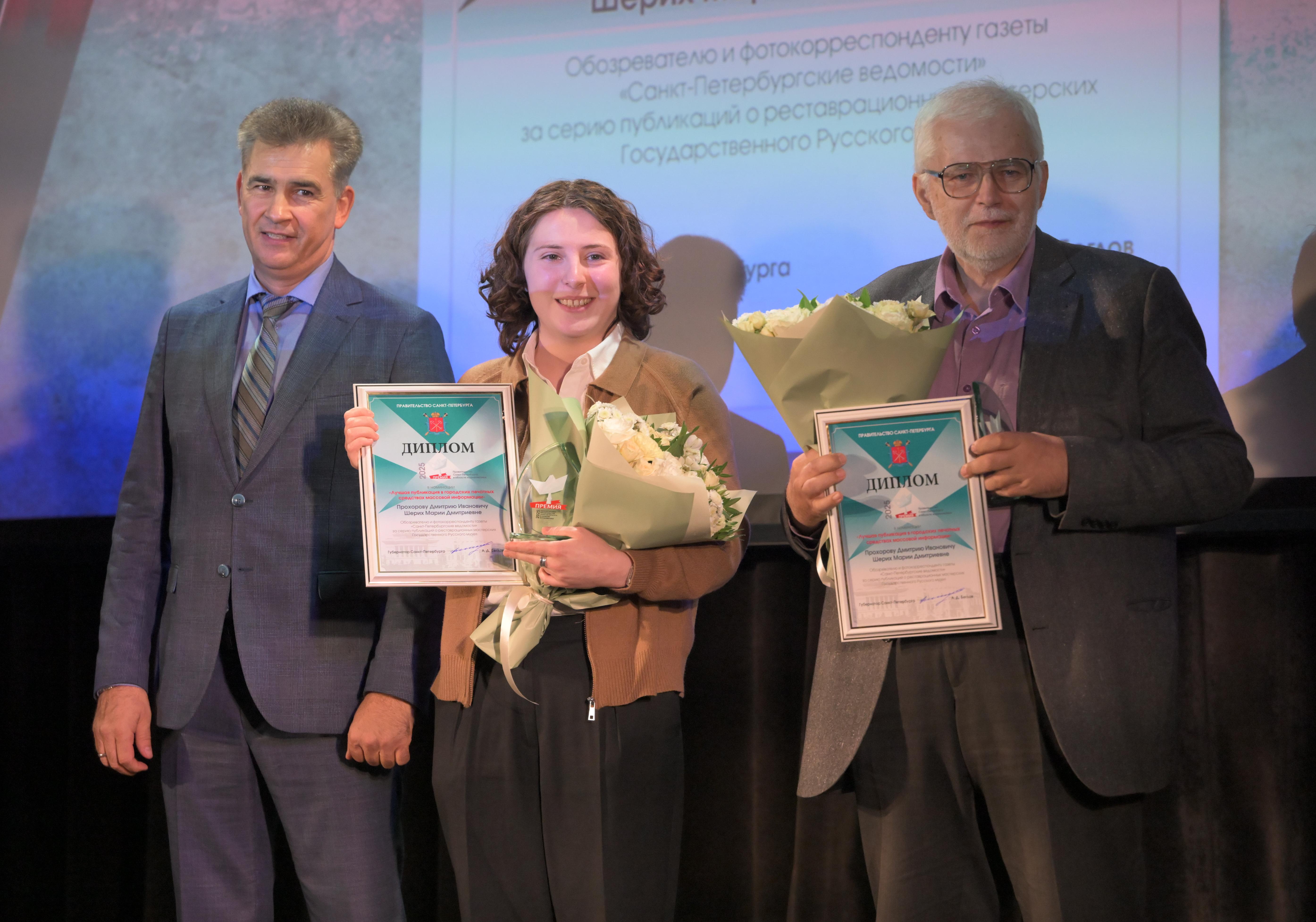 – В номинации «Лучшая публикация в городских печатных СМИ» – Дмитрий Прохоров и Мария Шерих, обозреватель и фотокорреспондент газеты «Санкт-Петербургские ведомости», за серию публикаций о реставрационных мастерских Русского музея.