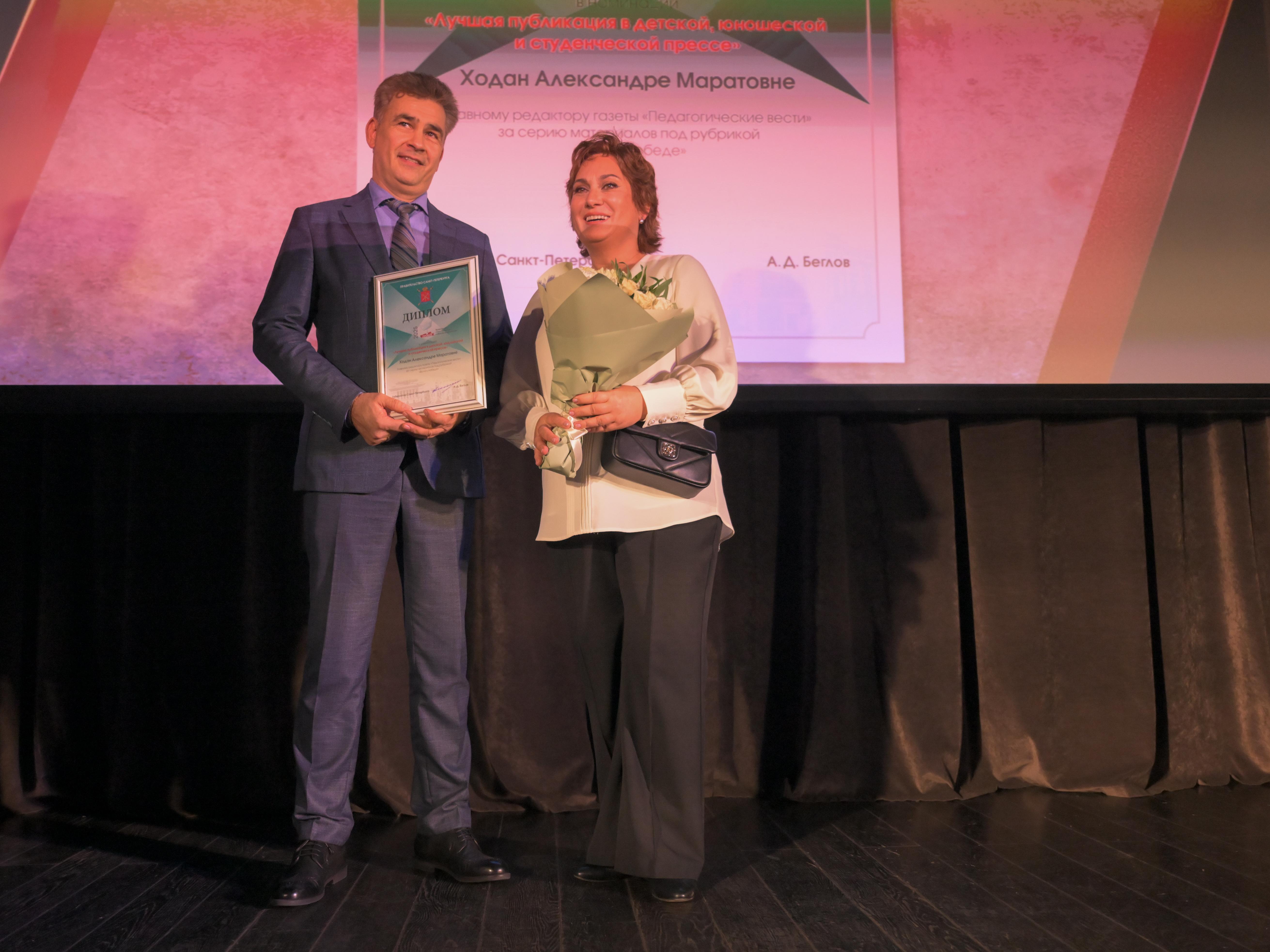 – В номинации «Лучшая публикация в детской, юношеской и студенческой прессе» – Александра Ходан, главный редактор газеты «Педагогические вести», за серию материалов «Воля к победе».