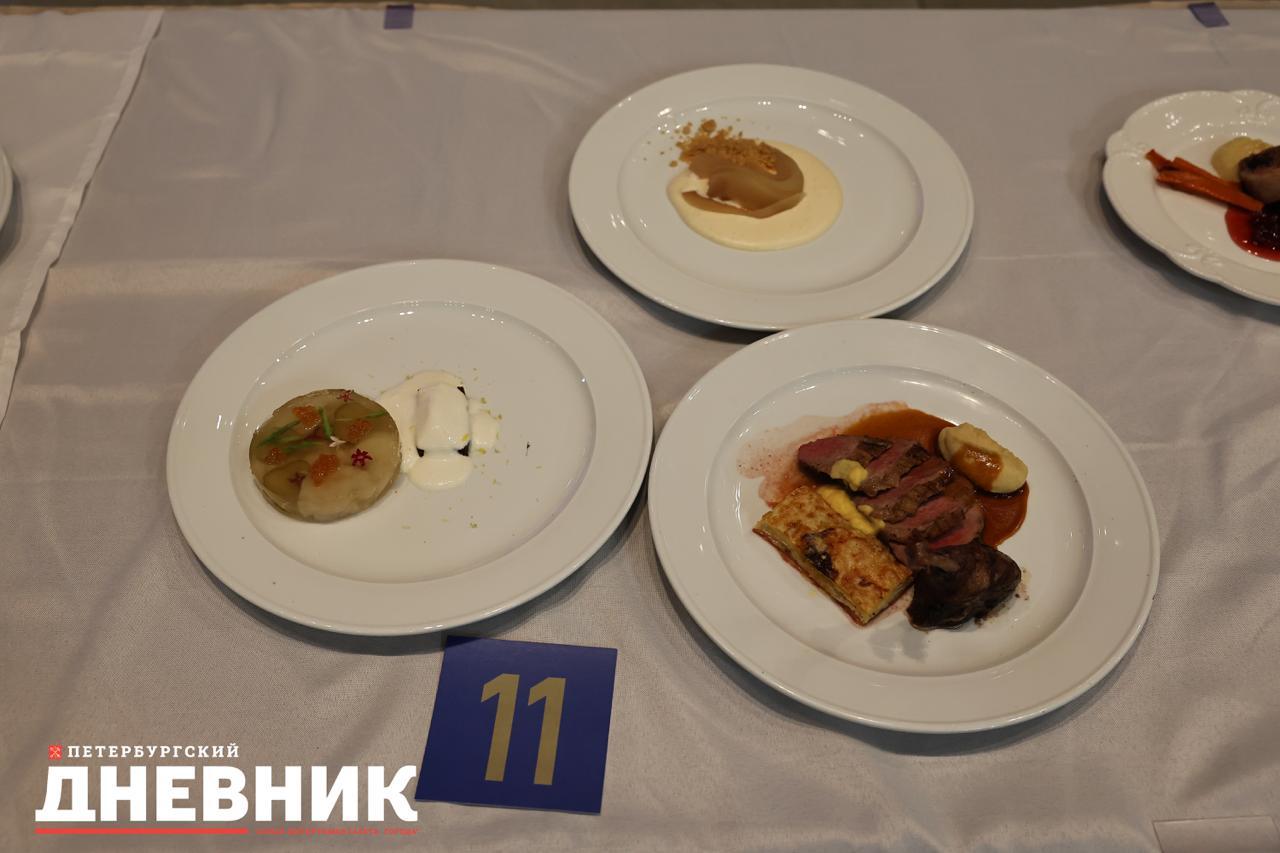 Напомним, в этом году, согласно конкурсному заданию, профессиональные кулинары должны были за два часа приготовить три блюда: закуску из филе трески, маринованных огурцов и желатина, горячее из утки и репы, а также десерт из груш, сахара и куриных яиц.