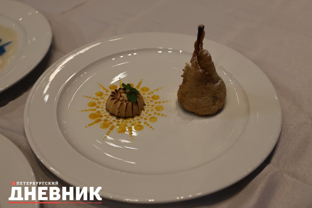 Кубок «Стерлядь в серебре» достался бренд-шефу, кондитеру петербургского ресторана «Фаворит» Егору Годуну. Он работал вместе с су-шефом Владиславом Баронецким.
