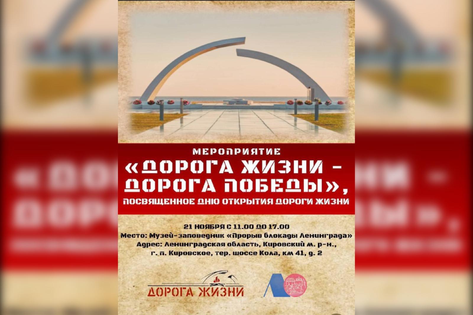 У музея‑заповедника «Прорыв блокады Ленинграда» 21 ноября состоится большое памятное мероприятие «Дорога Жизни – Дорога Победы», приуроченное к Дню открытия Дороги жизни. Организатором выступает музейно-мемориальный комплекс «Дорога жизни».