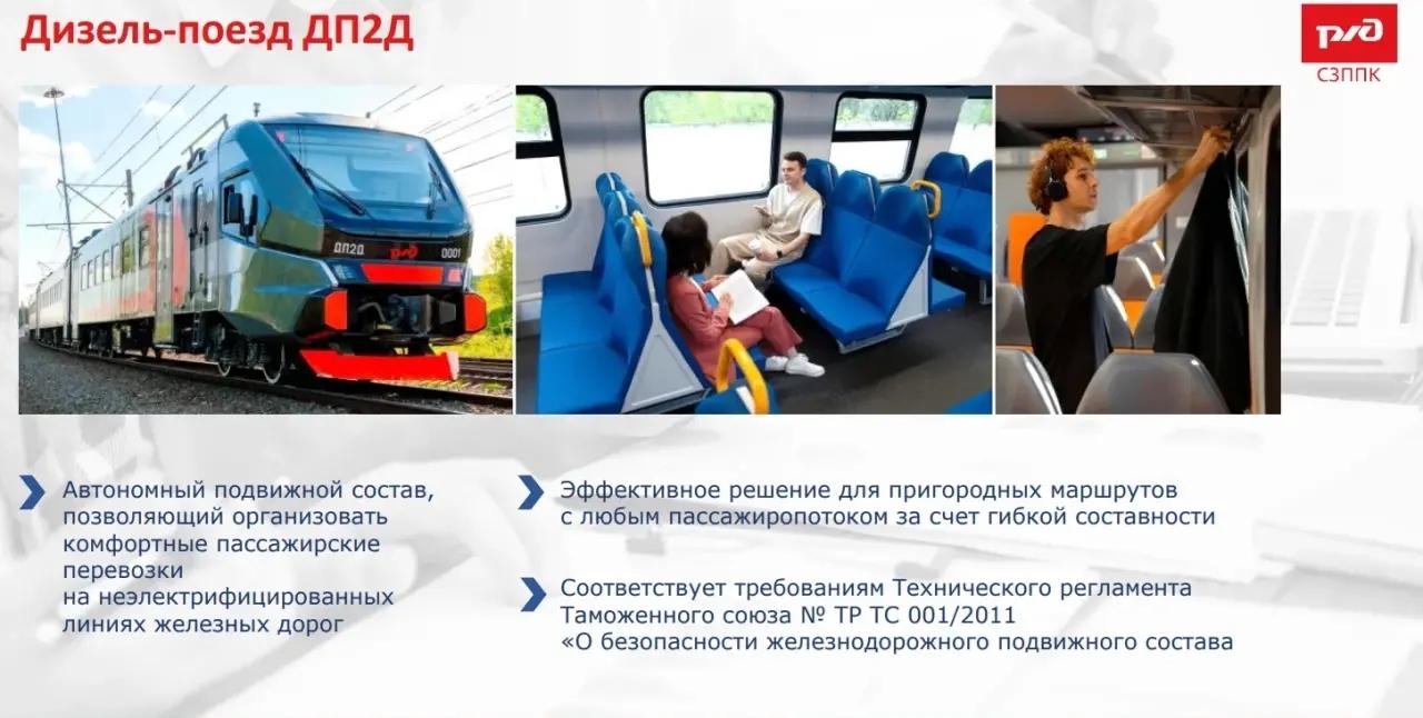 Планируется, что в 2026 году на маршруте «Санкт-Петербург – Кингисепп – Ивангород» начнет курсировать новый шестивагонный дизель-поезд ДП2Д. Состав рассчитан на 636 пассажиров и придет на смену эксплуатируемому в настоящее время трехвагонному поезду.