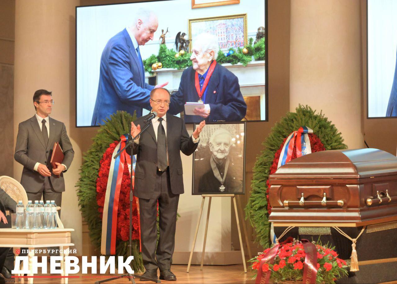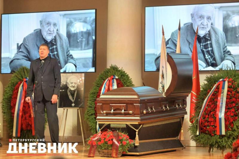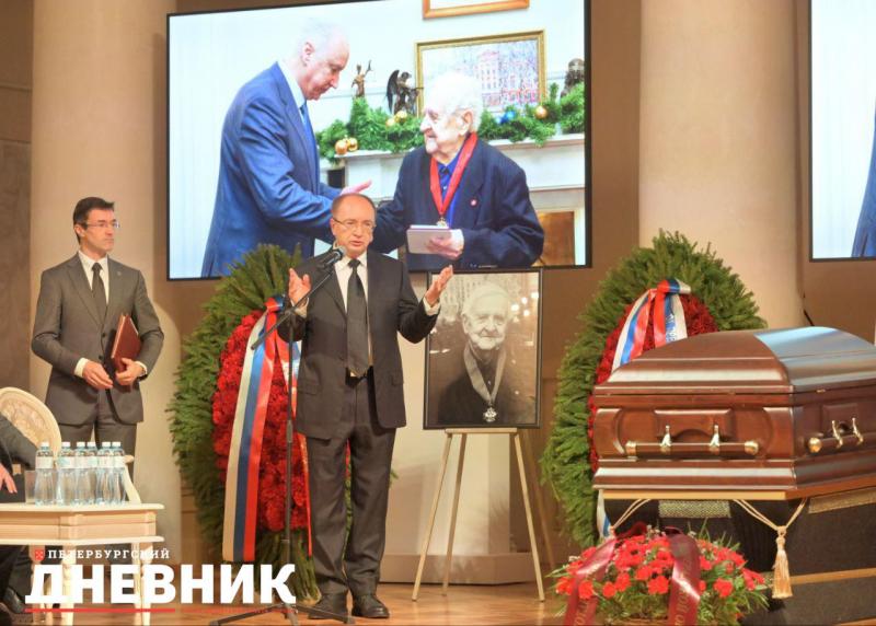 В стенах актового зала здания Двенадцати коллегий Санкт-Петербургского государственного университета проходит церемония прощания с ученым академиком РАН Георгием (Юрием) Толстым.