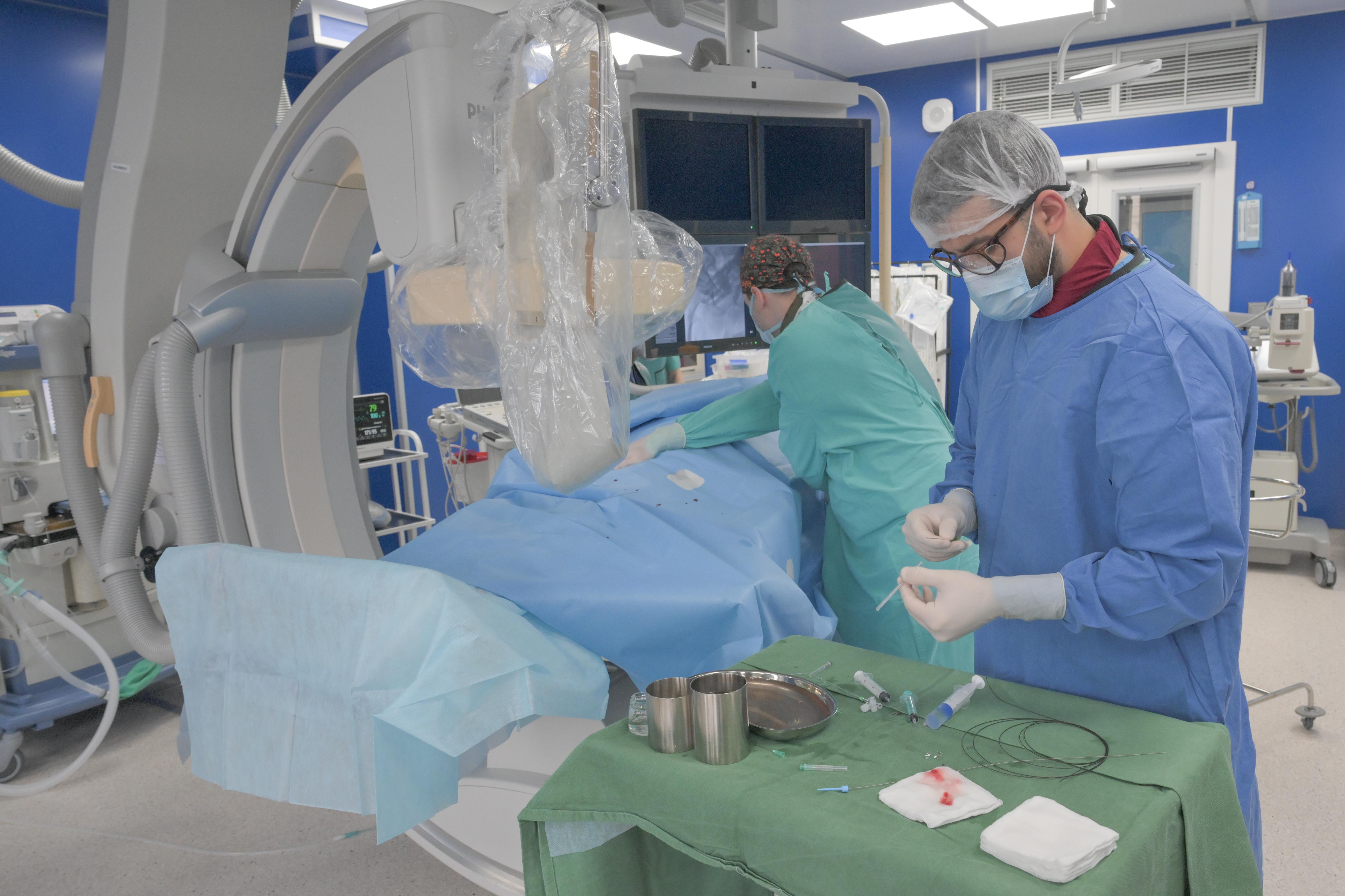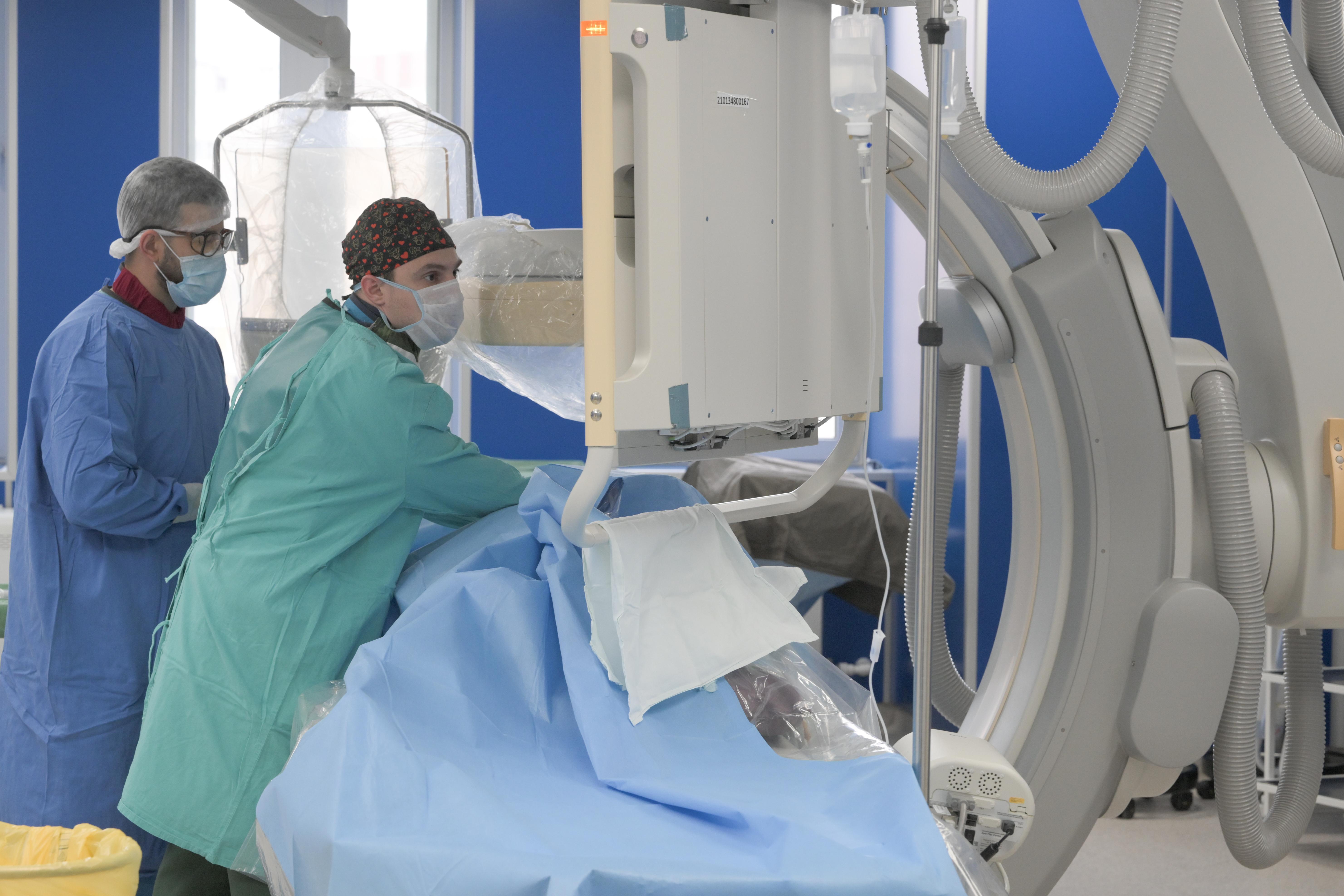 Операции проводятся под контролем ангиографа – устройства низкодозного излучения, рентгеновской установки, позволяющей видеть сквозь тело пациента. В процессе операции благодаря рентгеновскому детектору ангиохирурги видят сосуд изнутри.