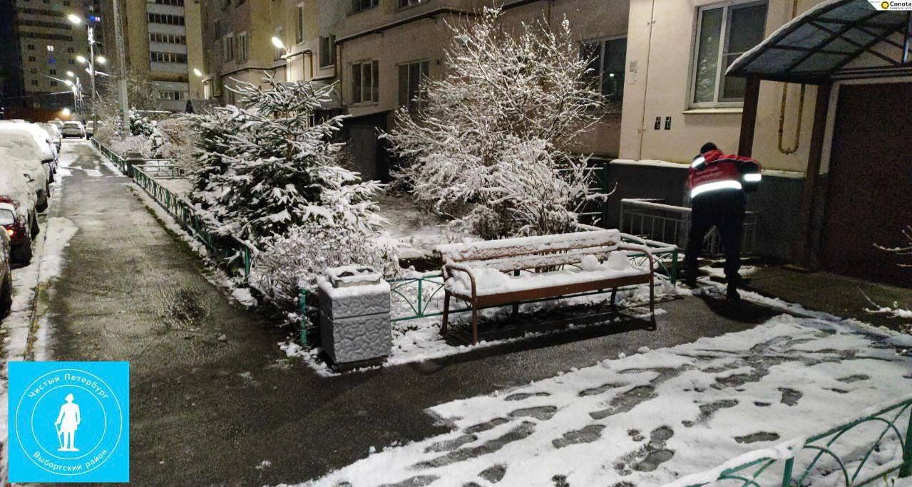 Ранним утром сотрудники жилищного агентства Выборгского района приступили к уборке первого снега.