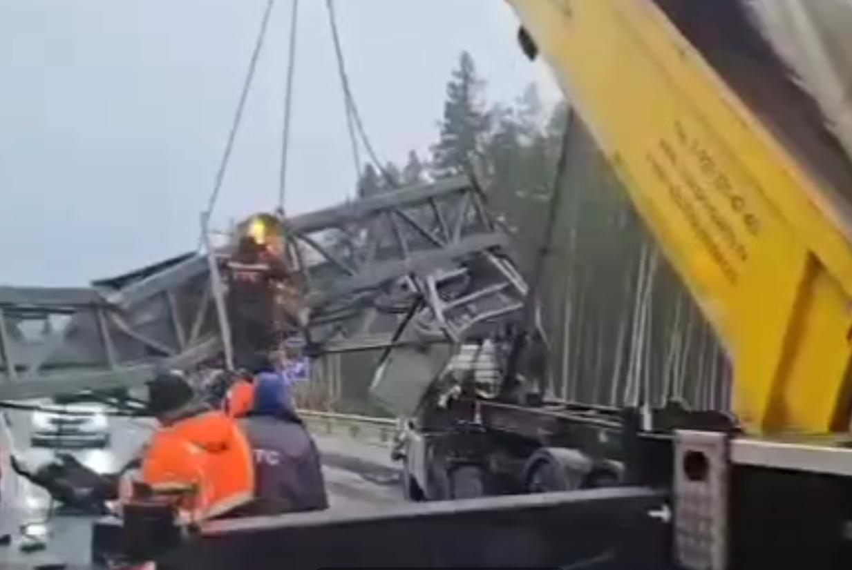 ДТП произошло утром 16 ноября. По предварительной информации, водитель большегруза забыл опустить кузов перед началом движения. Машина зацепила опору, на которой крепились дорожные знаки. Огромная металлическая конструкция рухнула прямо на проезжую часть, заблокировав обе полосы движения. К счастью, в этот момент на участке не было других автомобилей, поэтому обошлось без пострадавших.