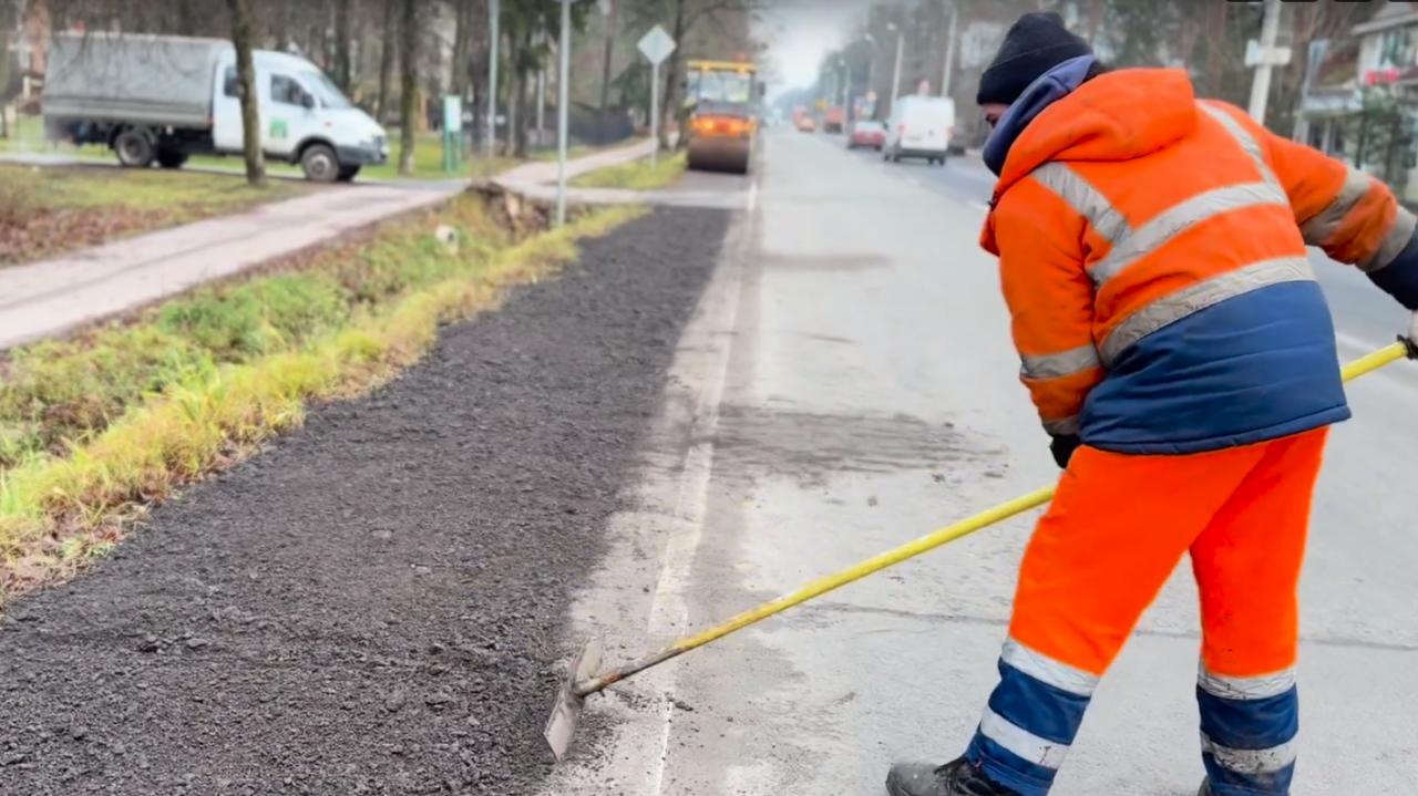 Сначала специалисты вручную распределяют асфальтобетонную крошку, затем выравнивается поверхность. Завершает процесс дорожный каток, утрамбовывая обочину.