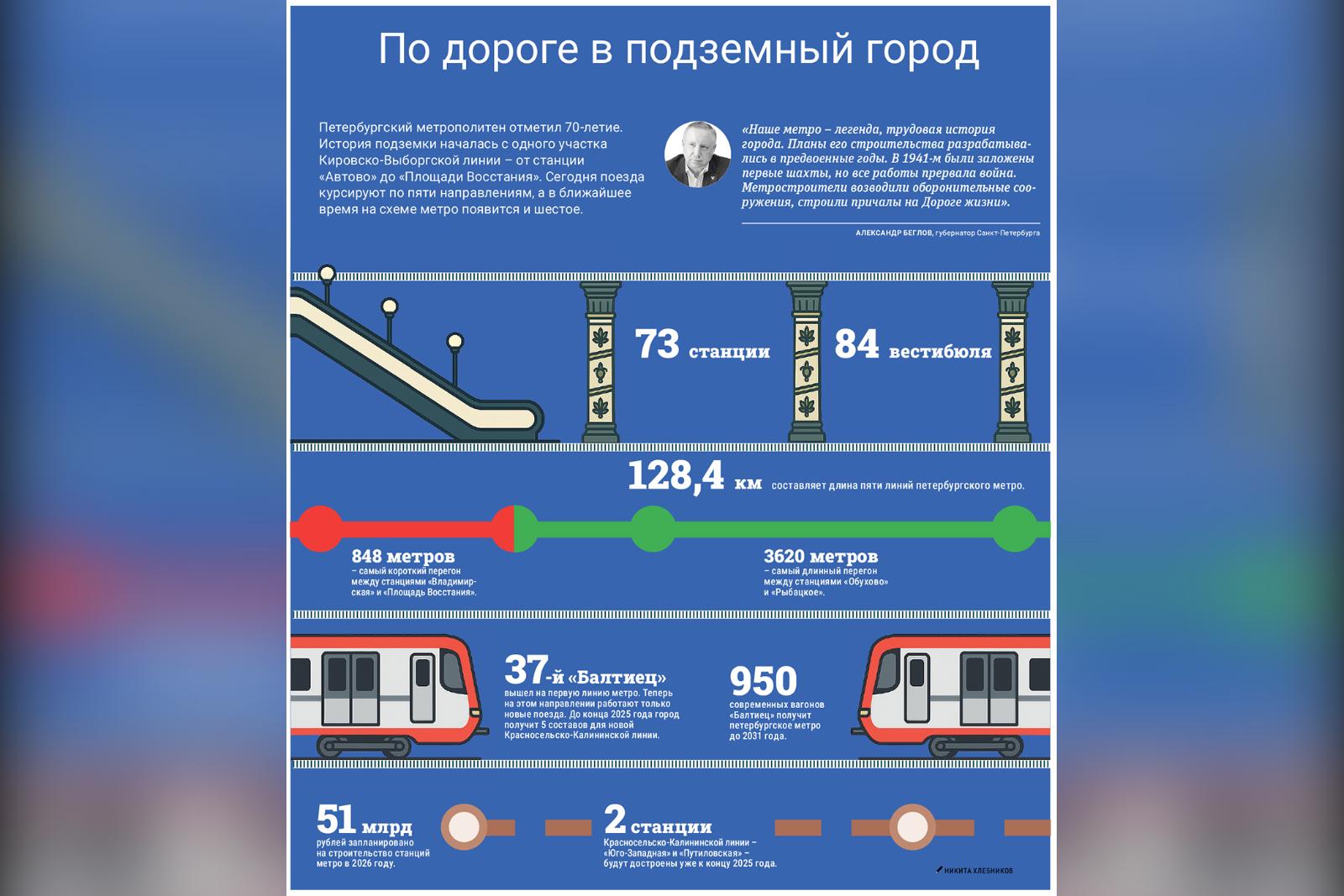 «Наше метро – легенда, трудовая история города. Планы его строительства разрабатывались в предвоенные годы. В 1941-м были заложены первые шахты, но все работы прервала война. Метростроители возводили оборонительные сооружения, строили причалы на Дороге жизни», – отметил губернатор Петербурга Александр Беглов.