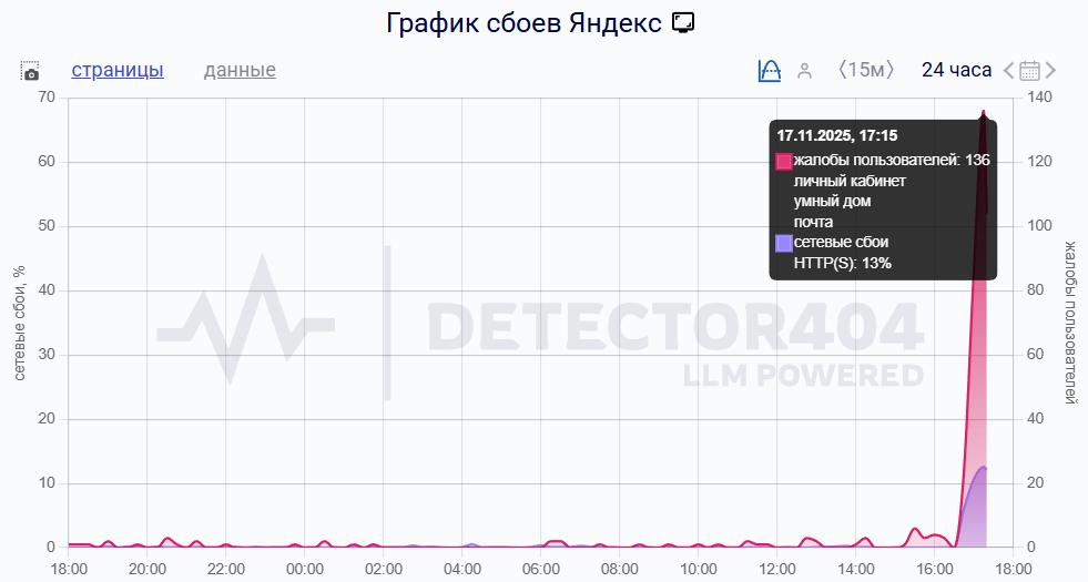 Пик жалоб, согласно графику сбоев, приходится на 17:15. Больше всего жалоб поступает из Москвы (20%), Санкт-Петербурга (20%), Калининградской (7%), Смоленской (7%) и Московской областей (5%).