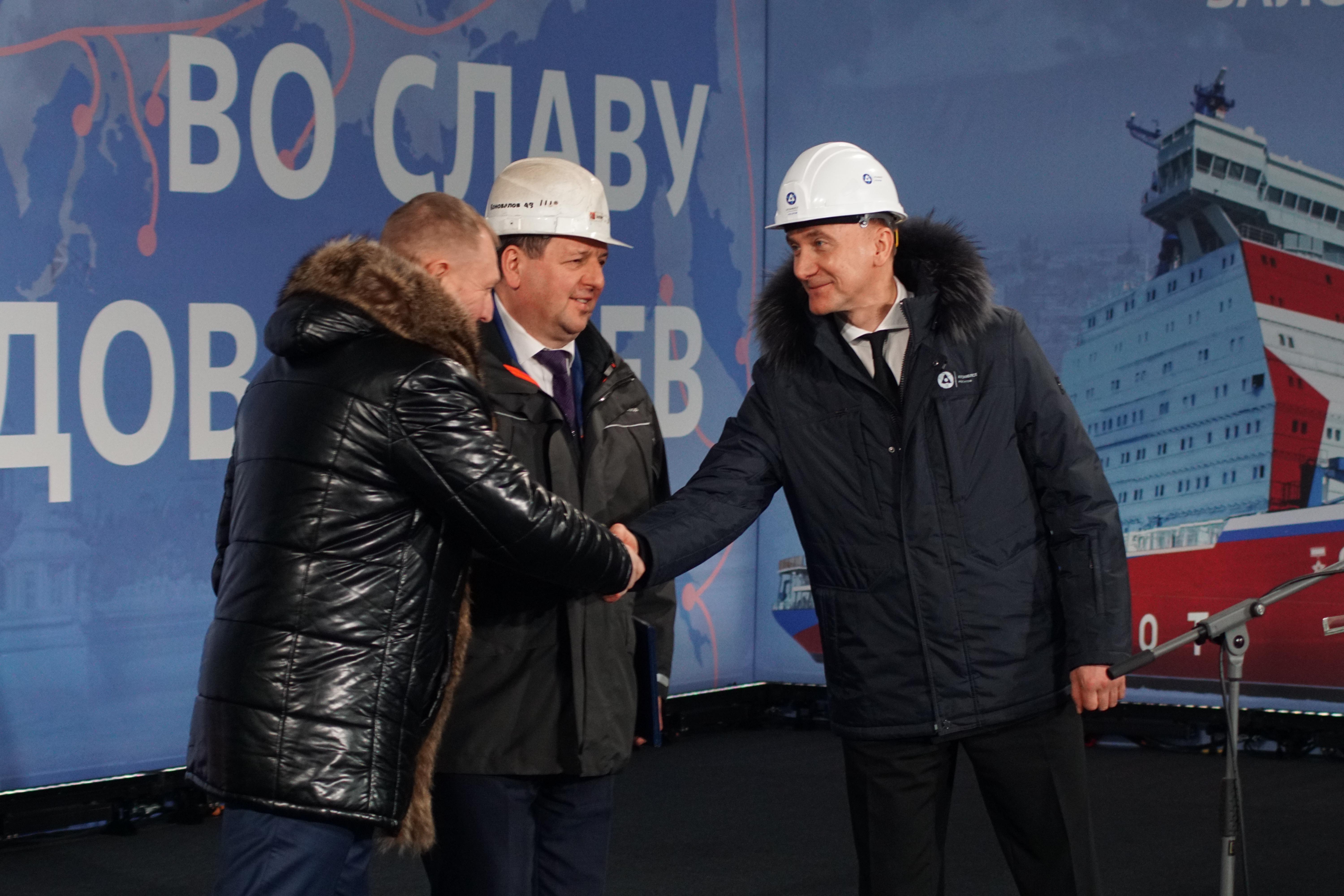 Генеральный директор «Атомфлота» Яков Антонов, директор филиала по атомным судам ФАУ «Российский морской регистр судоходства», гендиректор Балтийского завода Александр Коновалов подписали акт о закладка ледокола «Сталинград».