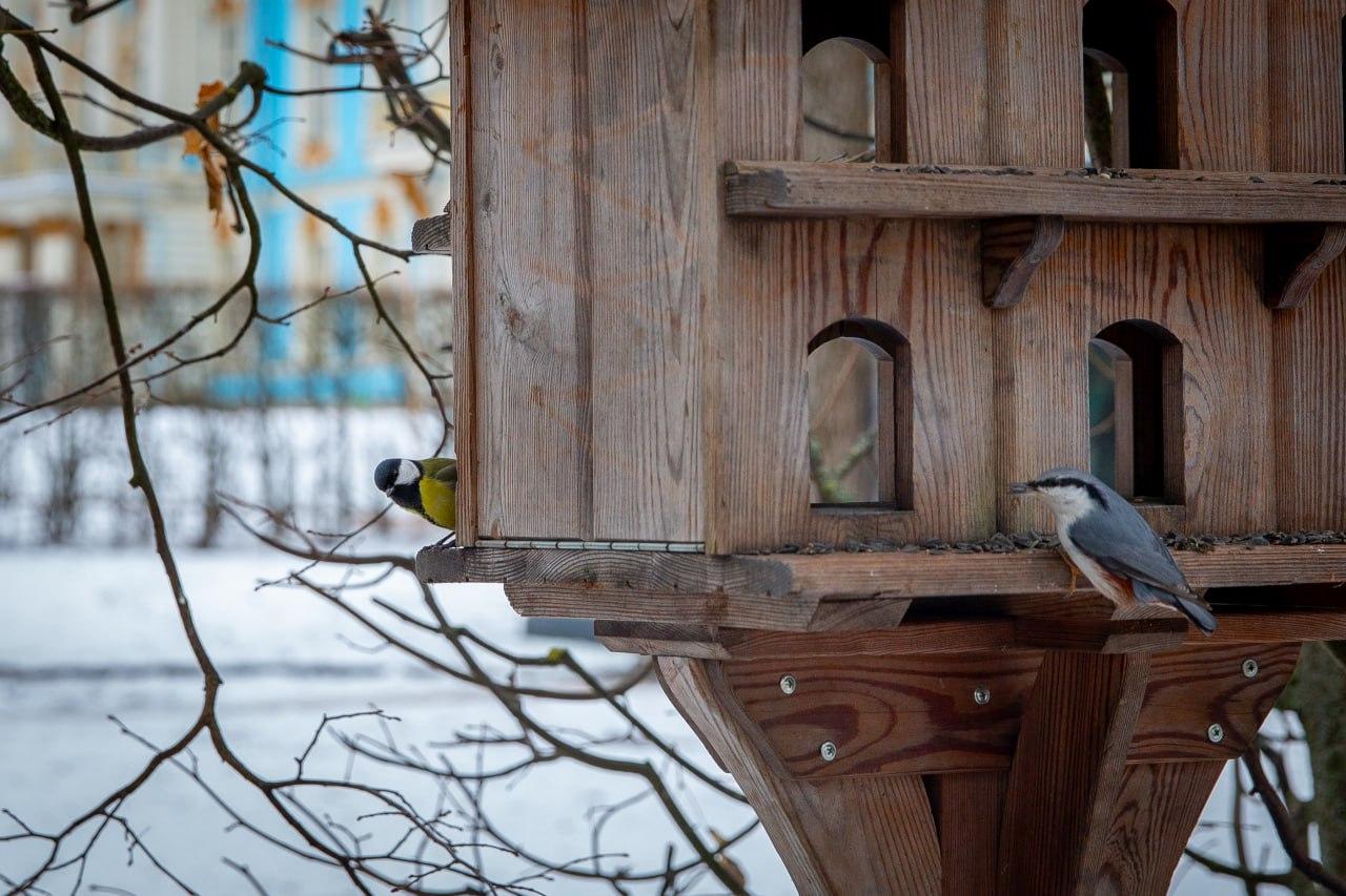 В парковых зонах – Екатерининском, Александровском и Баболовском парках – установлено 60 так называемых «птичьих столовых». Чтобы не повреждать деревья, кормушки не подвешивают, а вкапывают в землю. Одна из самых эффектных конструкций – двухэтажная кормушка у главного входа в Екатерининский парк, выполненная по образцам из каталогов «садовых затей» 18-го века. Одновременно там могут подкрепиться до 12 птиц.