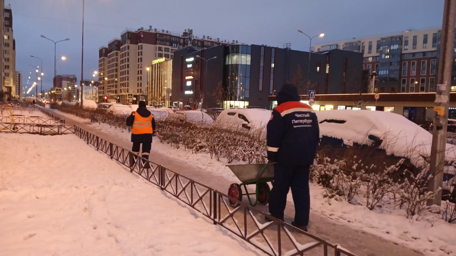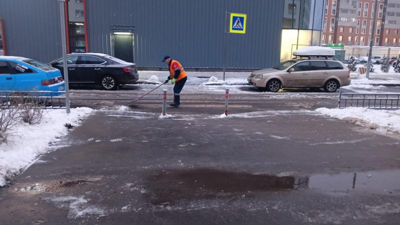 Контент-центр Красносельского района опубликовал видео, на котором можно увидеть, что в уборке задействованы как снегоуборочные машины, так и дворники. Особое внимание уделяется подходу к парадным домов.