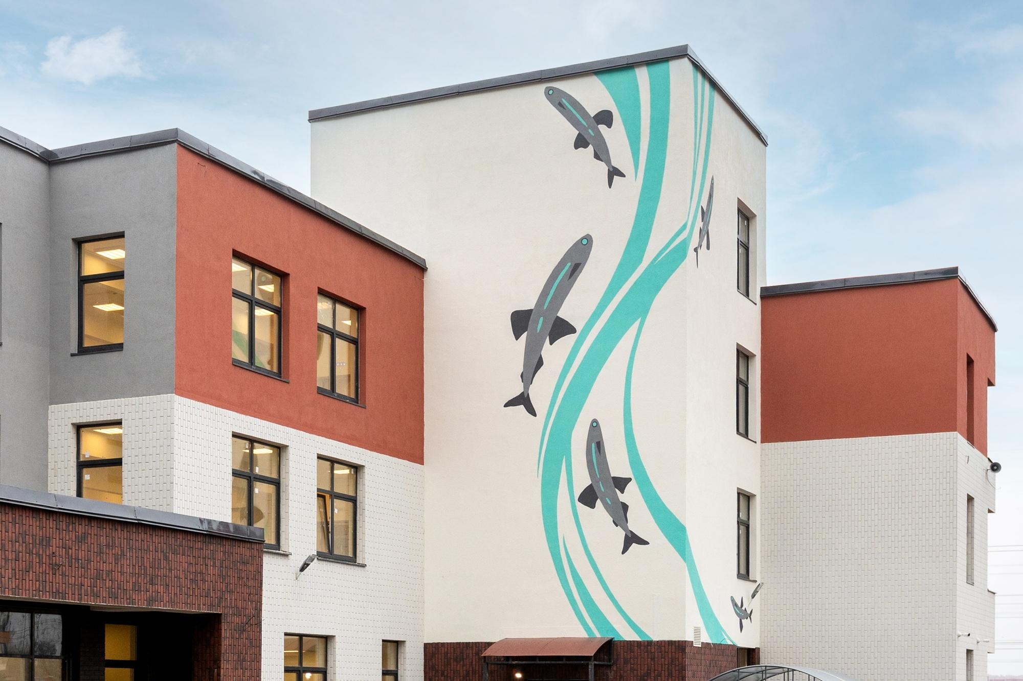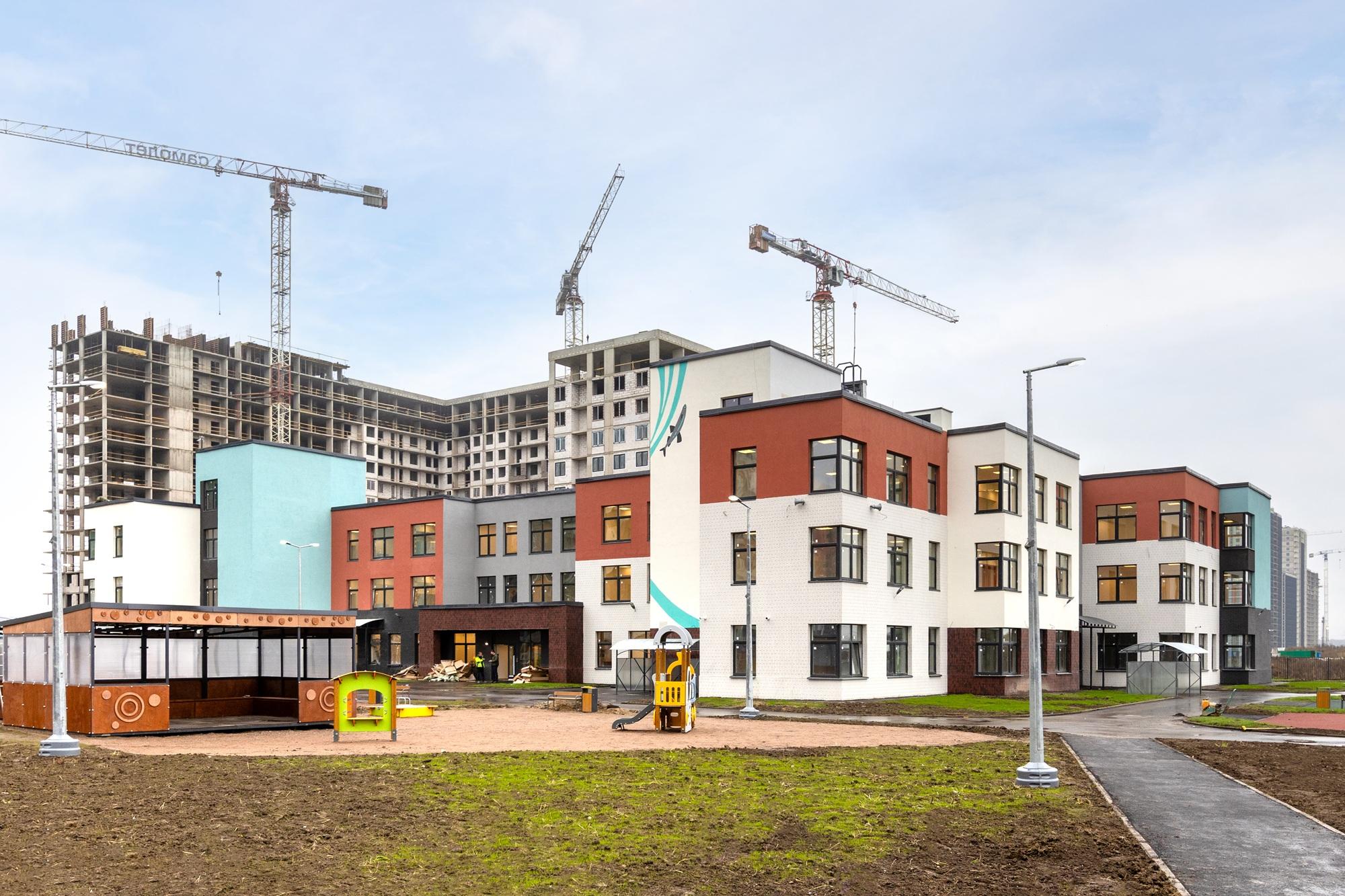 В жилом комплексе «Город Первых» ввели в эксплуатацию новый современный детский сад, который смогут посещать 325 детей от года до семи лет. Здание с яркими фасадами, украшенными изображениями корюшки – символа Ленинградской области, построено с учетом всех современных требований.