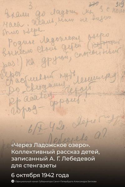Беглов приводит и живые свидетельства тех лет. Воспитательница 28-го детского дома Надежда Васильевна Строгонова вспоминала, описывала, как был организован совет самоуправления, чтобы вернуть детей к жизни. Их партиями отправляли по Дороге жизни на Большую землю. В коллективном рассказе «Через Ладожское озеро» ребята описывали, как грузовик осторожно шёл среди воды, а пробегавший мимо военный подбадривал детей.