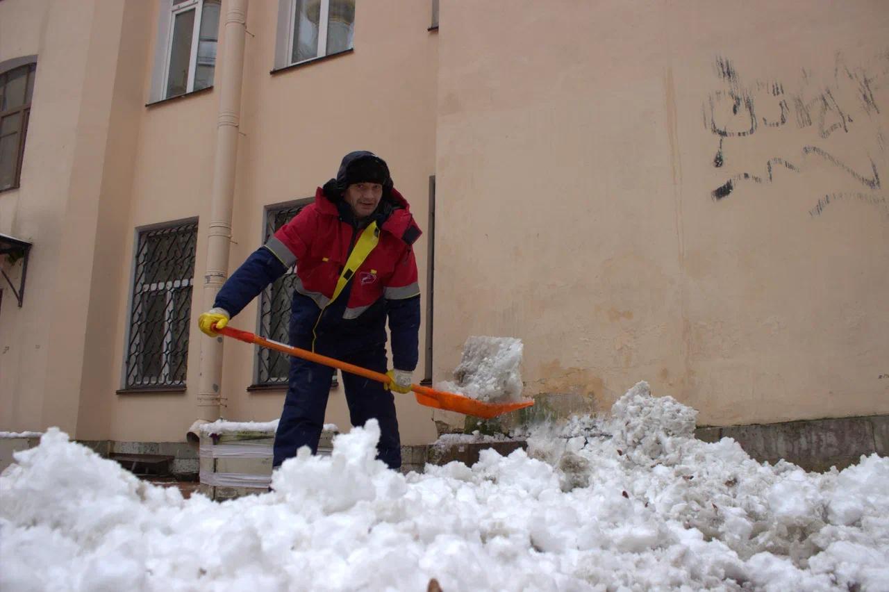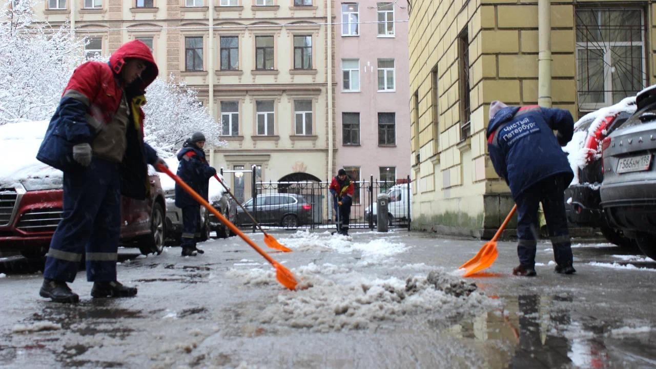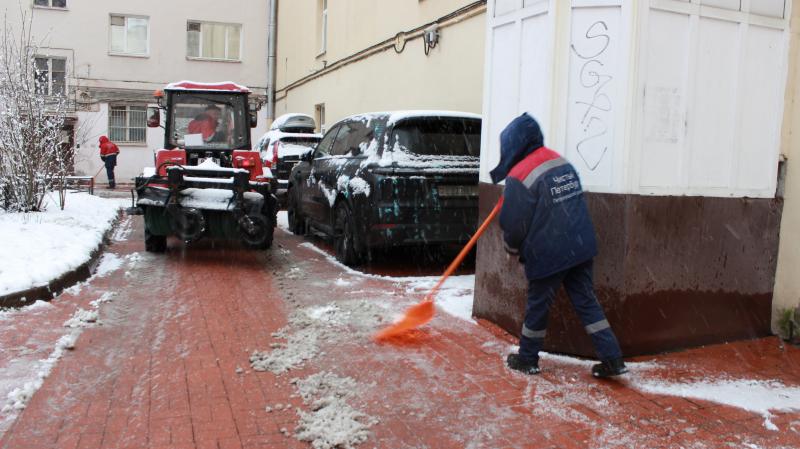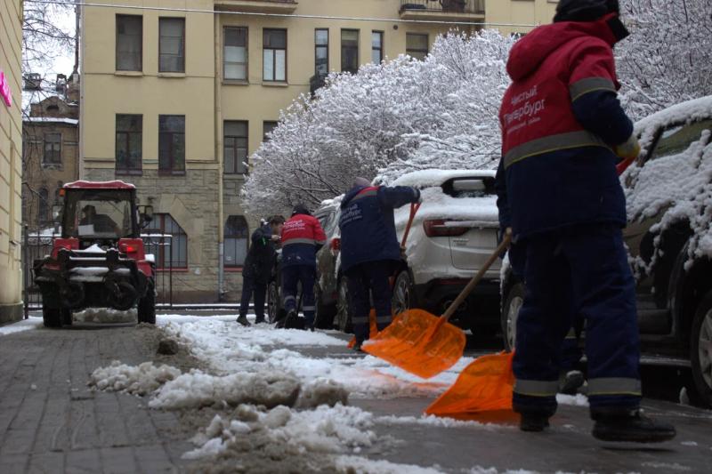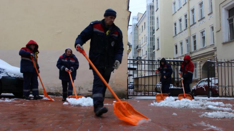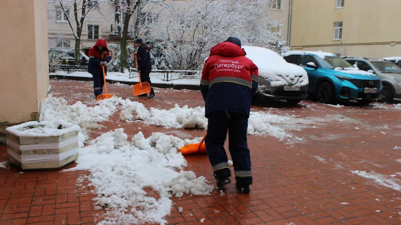 На борьбу с последствиями снежной стихии в Петроградском районе вышла не только уборочная техника, но и дворники, кадры их работы оказались в распоряжении «Петербургского дневника».
