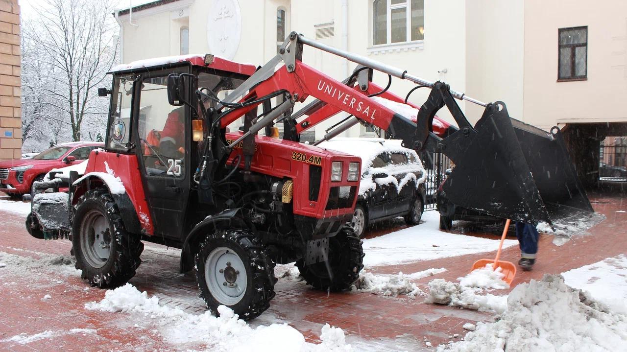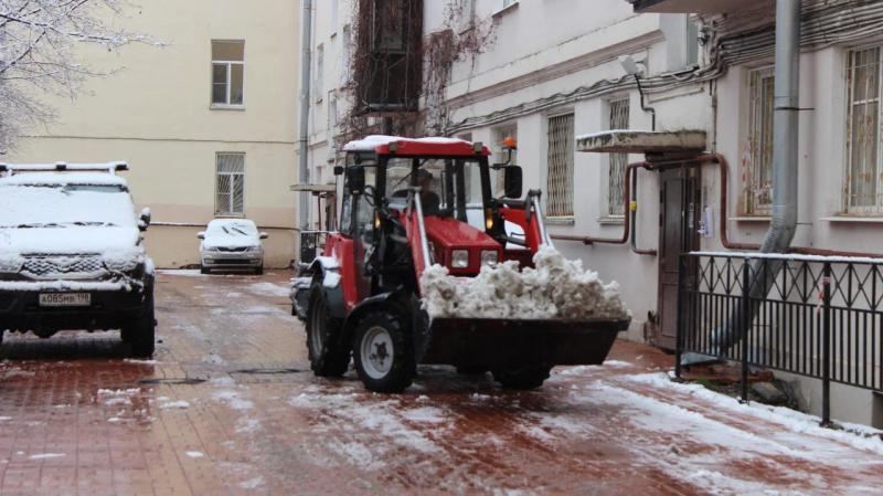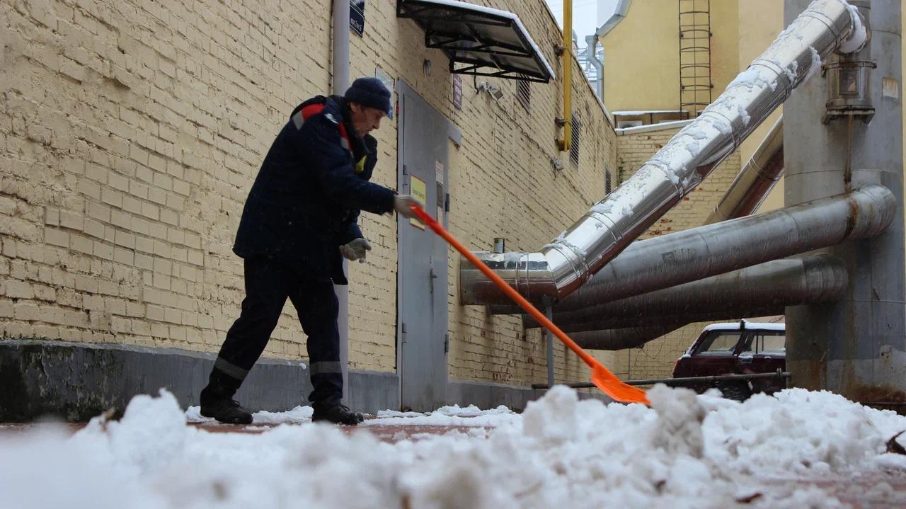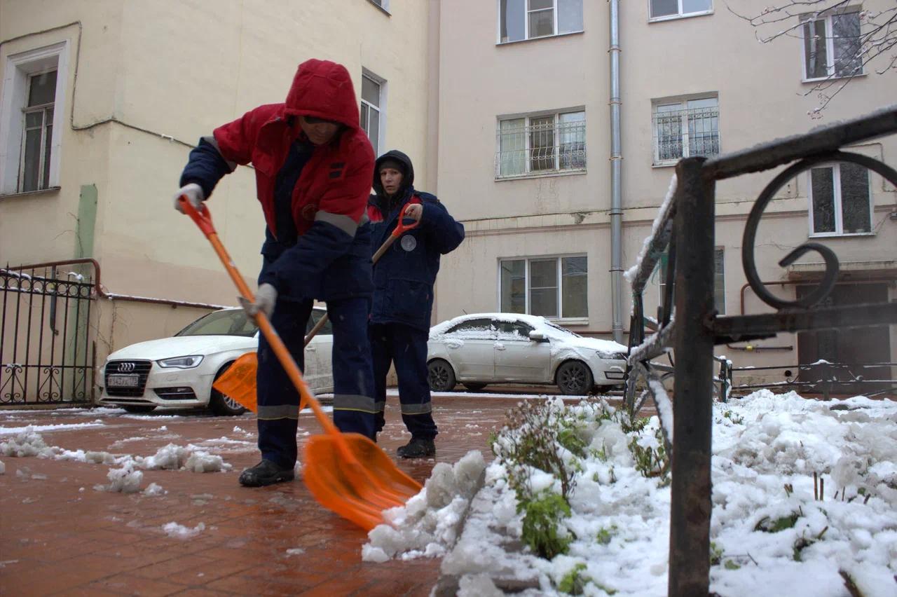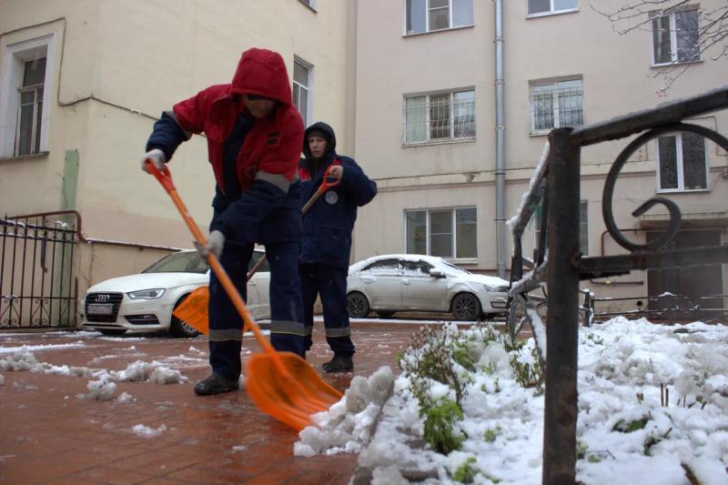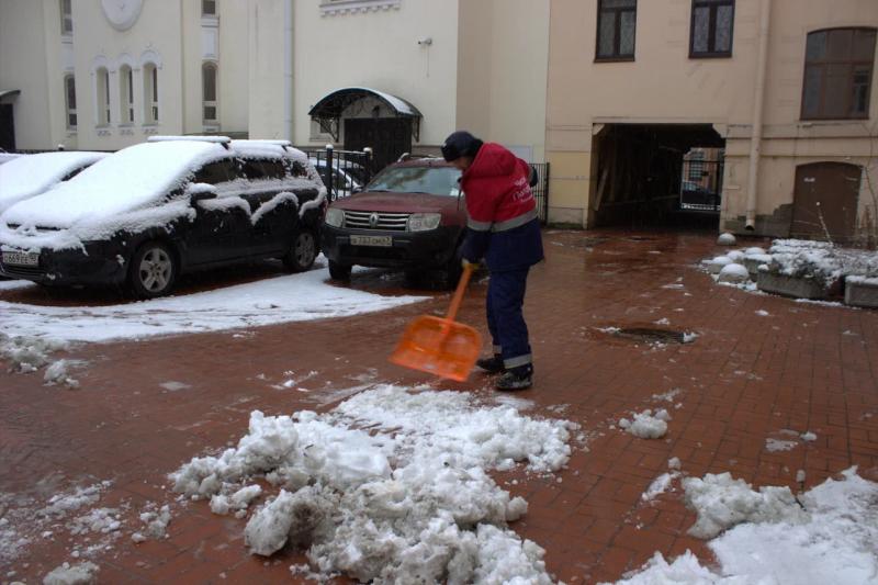 На борьбу с последствиями снежной стихии в Петроградском районе вышла не только уборочная техника, но и дворники, кадры их работы оказались в распоряжении «Петербургского дневника».