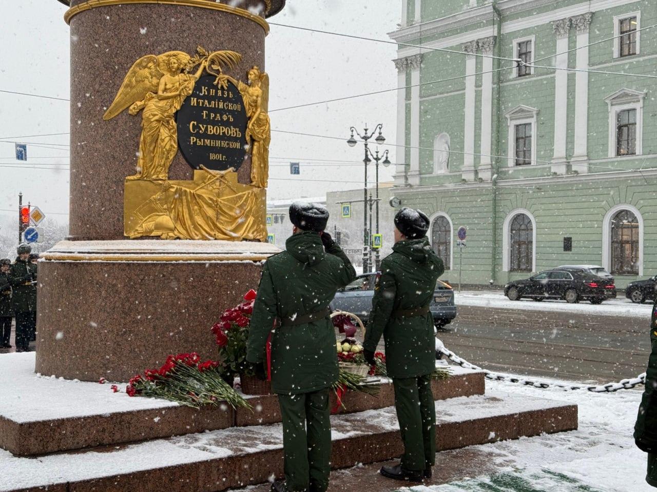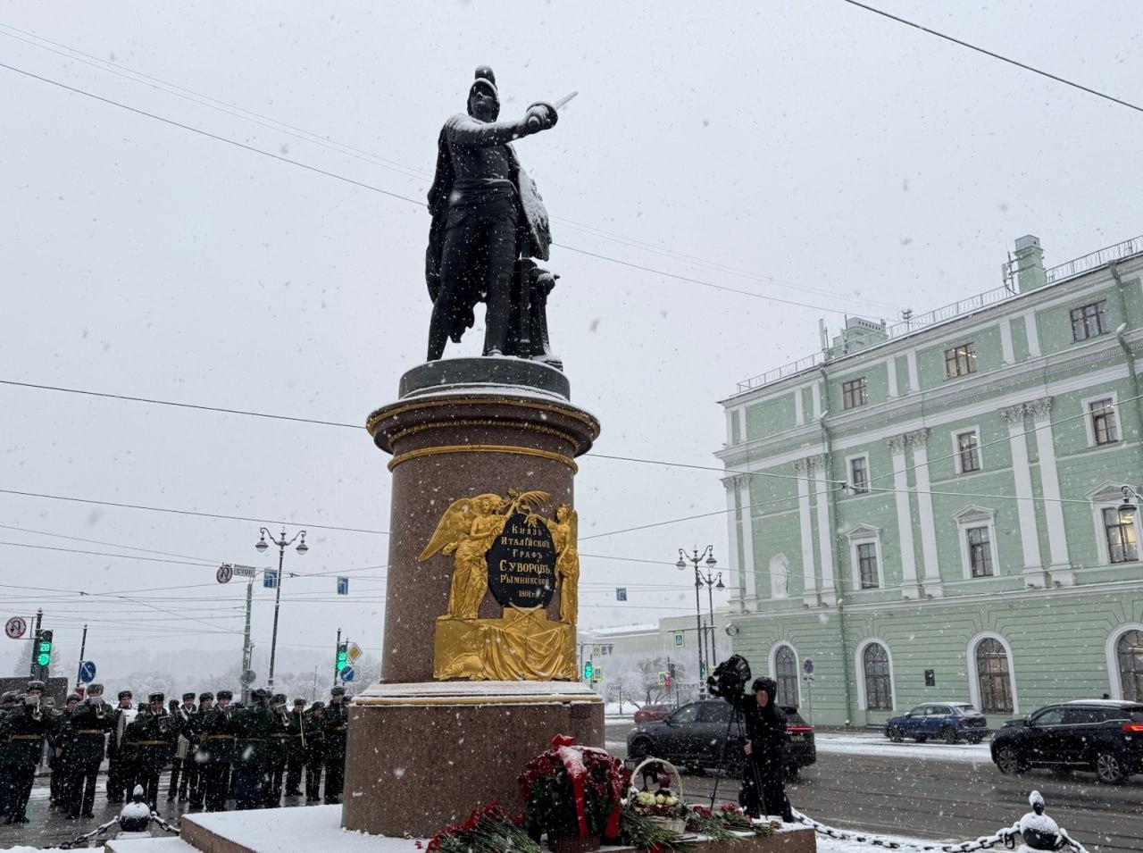 На Суворовской площади в Санкт-Петербурге прошла торжественная церемония, посвящённая 295-летию со дня рождения великого русского полководца Александра Васильевича Суворова. Участники мероприятия возложили цветы к его памятнику. В начале церемонии прозвучал гимн России.