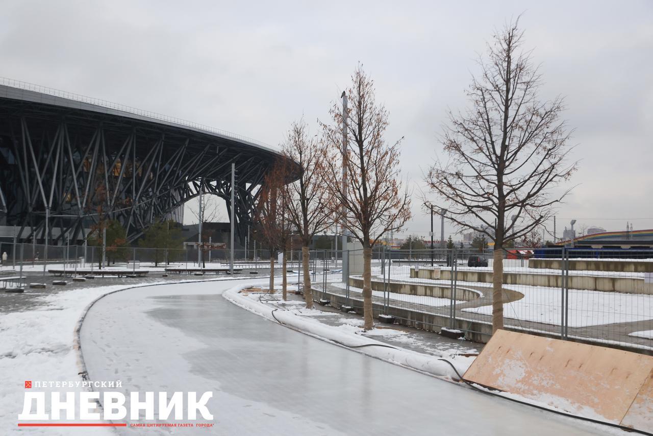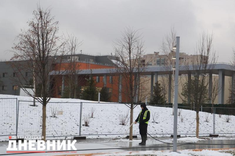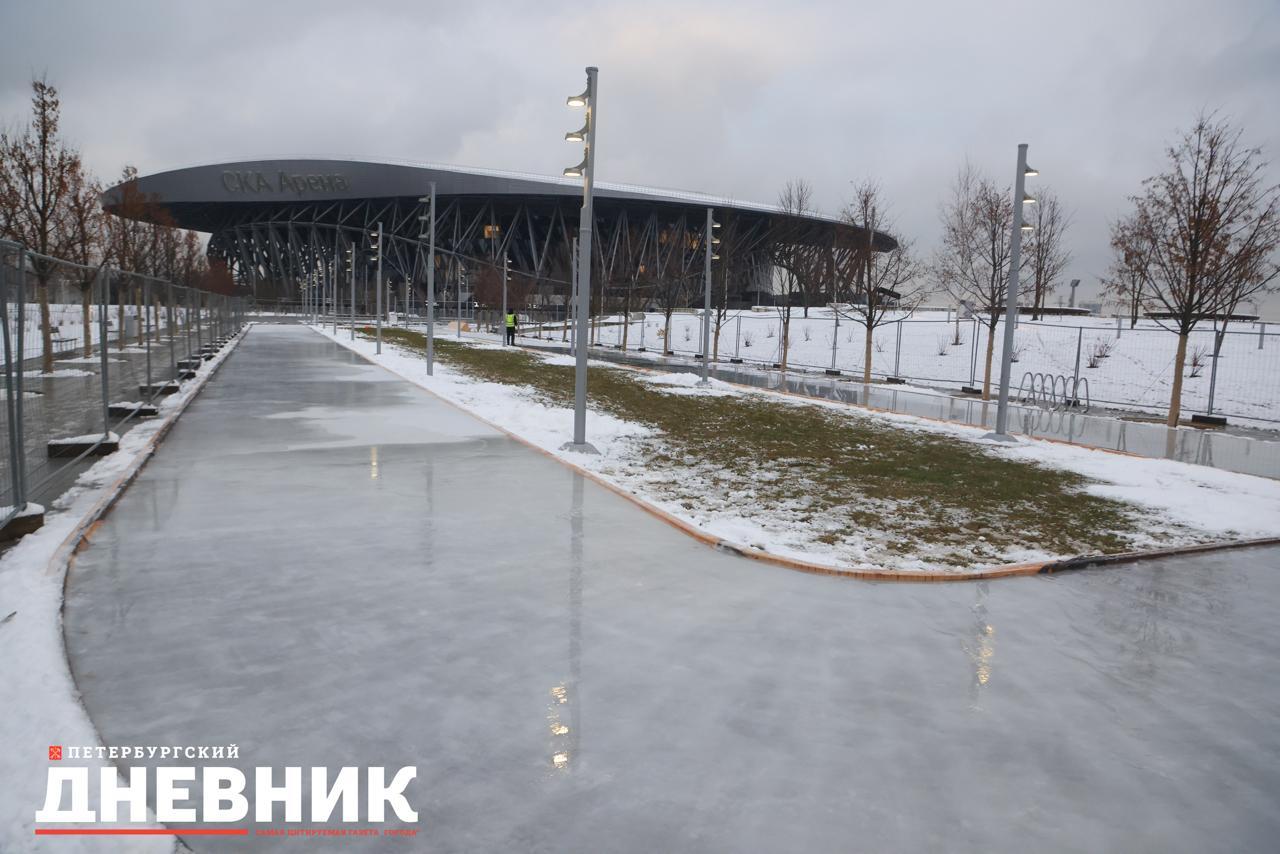 В Петербурге в воскресенье, 7 декабря, в 12:00 для горожан и гостей Северной столицы откроется уличный каток в парке у «СКА Арены». Фотограф «Петербургского дневника» Александр Глуз запечатлел, как подготавливают территорию: заливают лед, устанавливают защитные ограждения и расчищают снег.